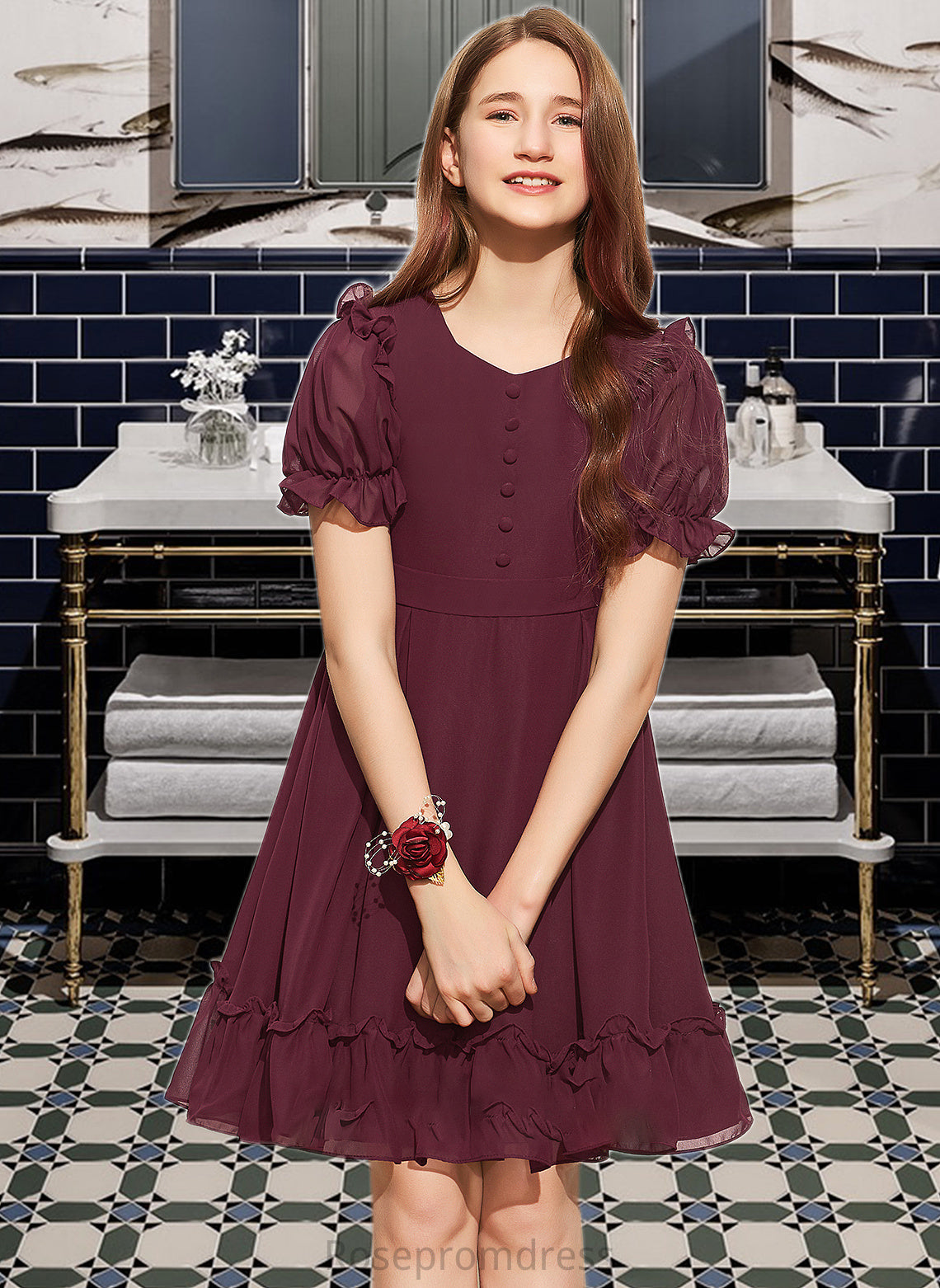 Charlotte A-Line Scoop Neck Knee-Length Chiffon Junior Bridesmaid Dress With Bow(s) Cascading Ruffles SRSP0013550
