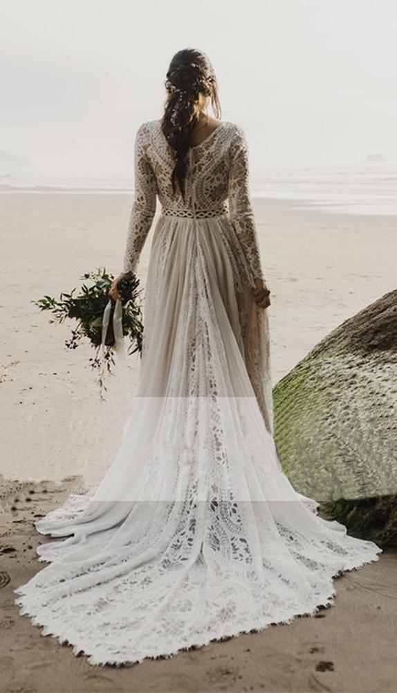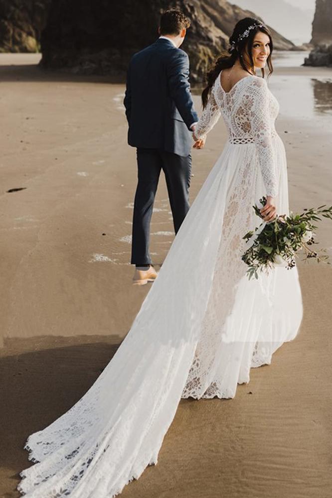 Charming A Line Long Sleeves V Neck Lace Ivory Beach Wedding Dresses, Bridal SRS20395