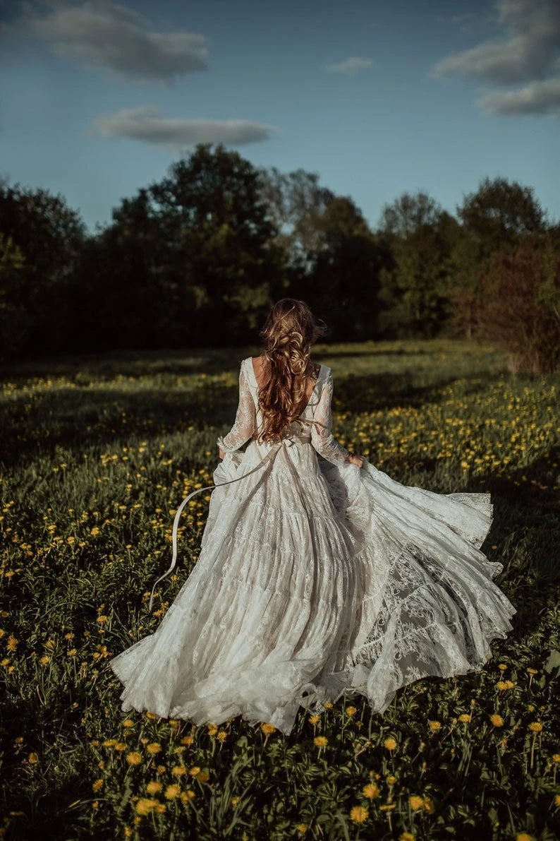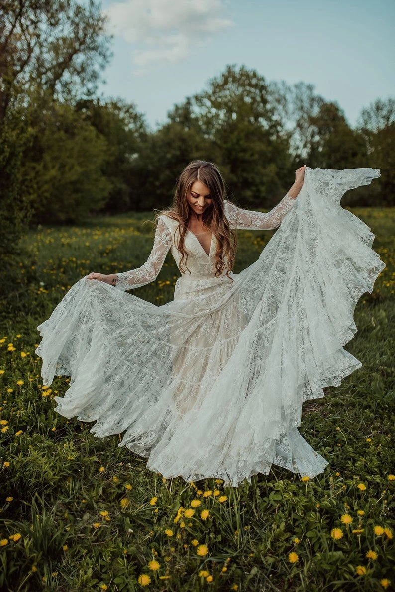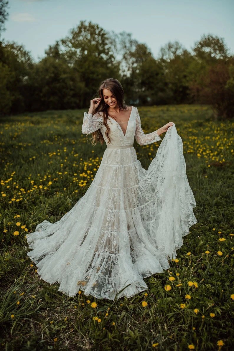 Charming Long Sleeves Lace V Neck Bohemian Backless Beach Wedding SRS15628
