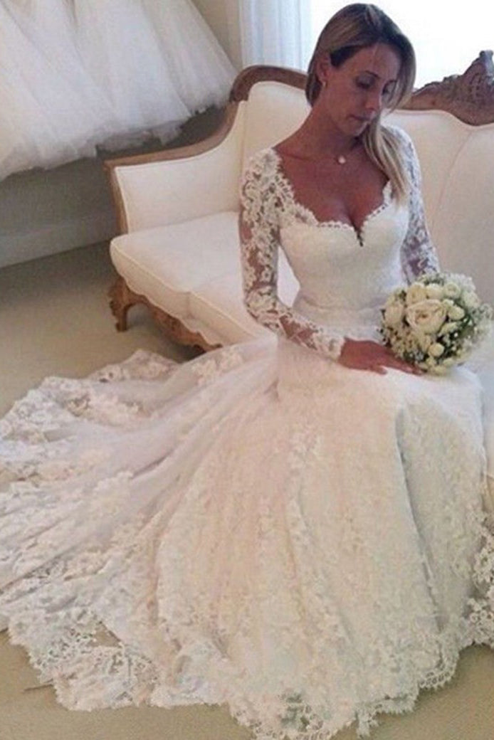 Charming Long Sleeves V Neck Sweep Train Wedding Dresses Lace Appliques
