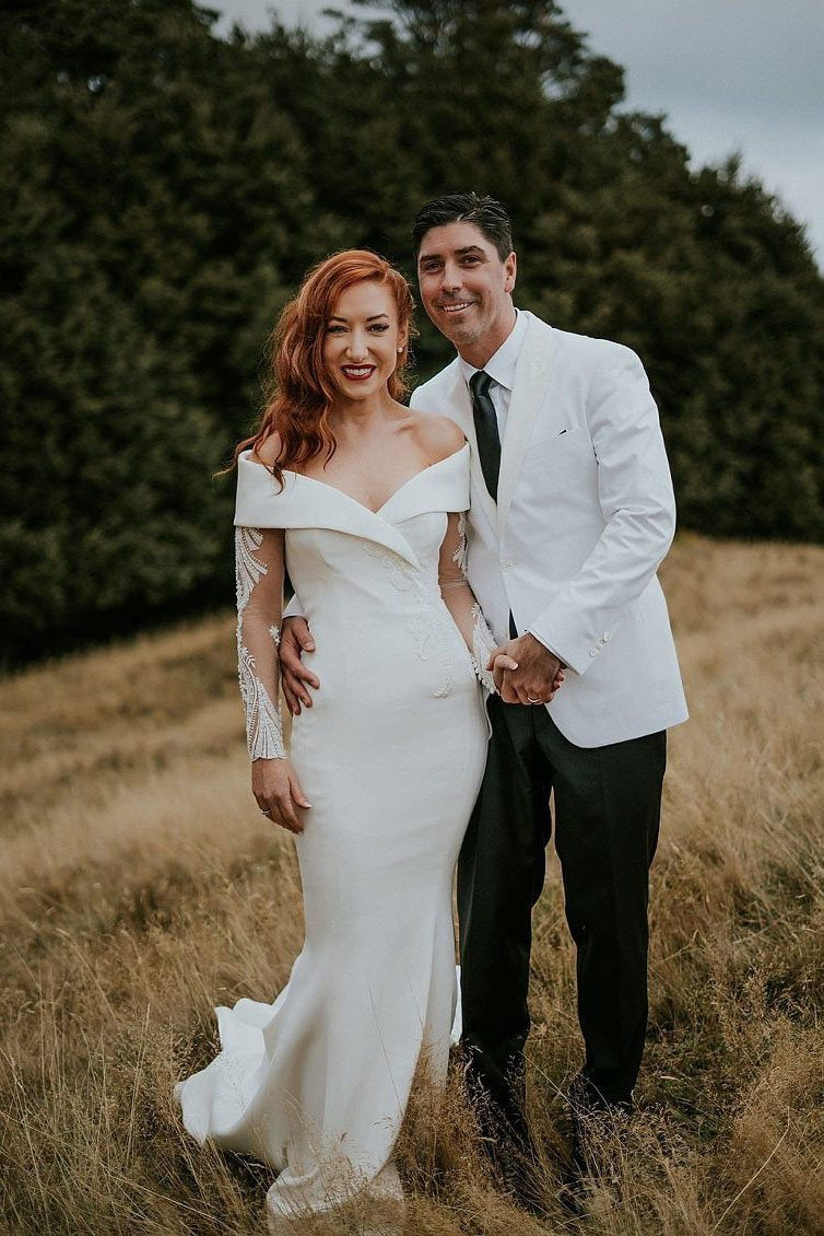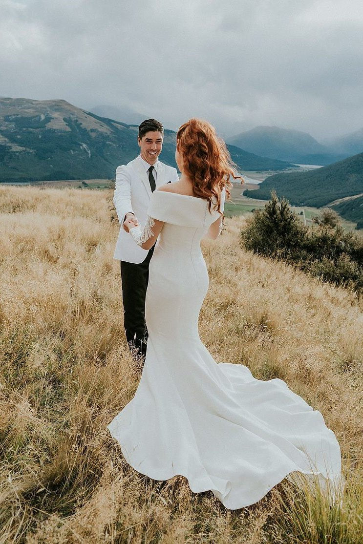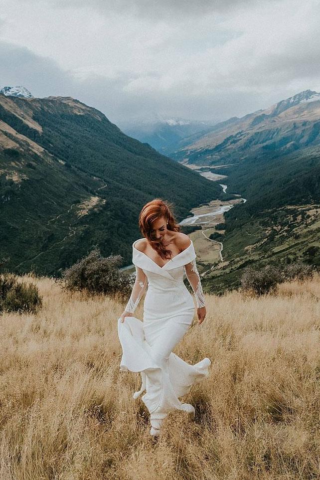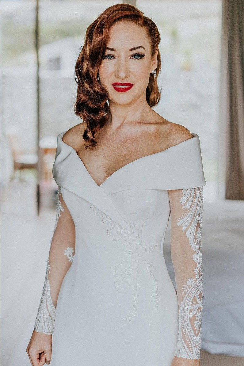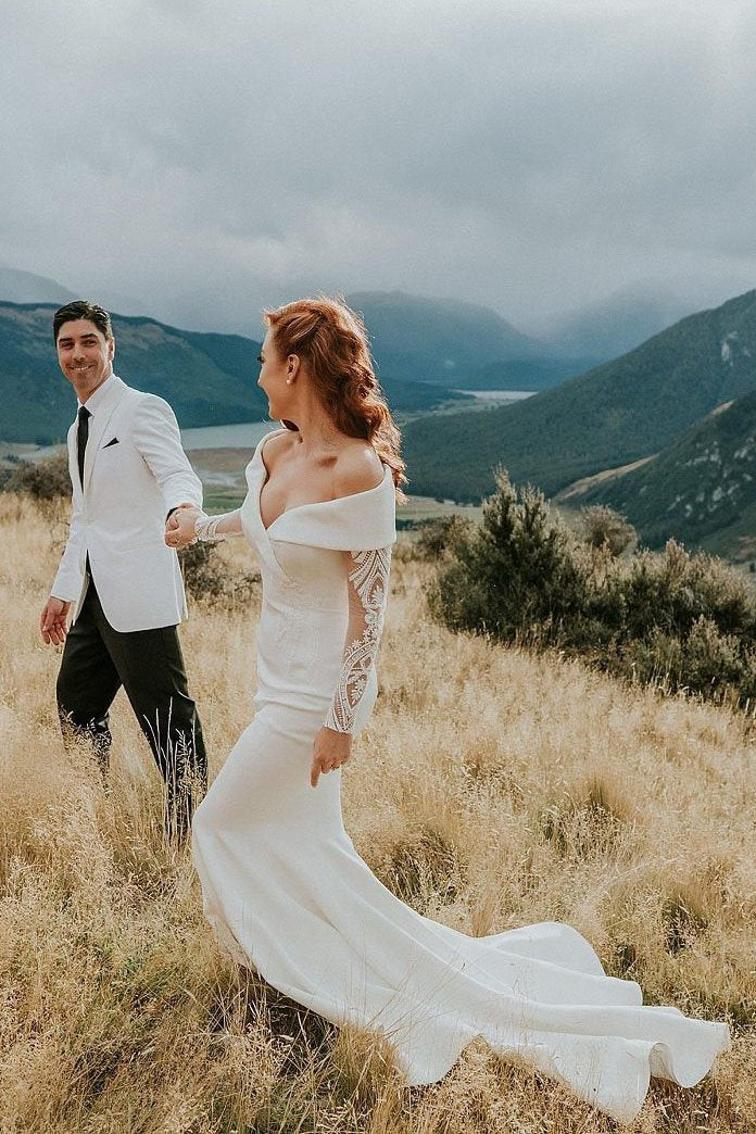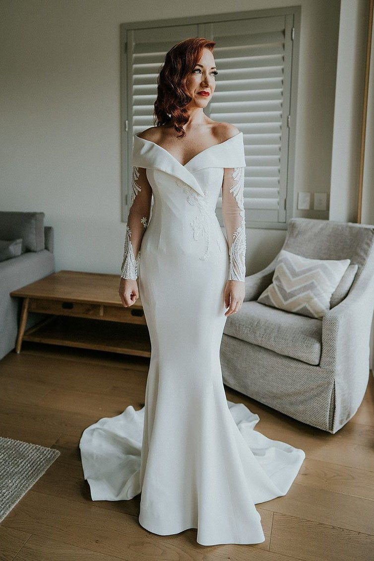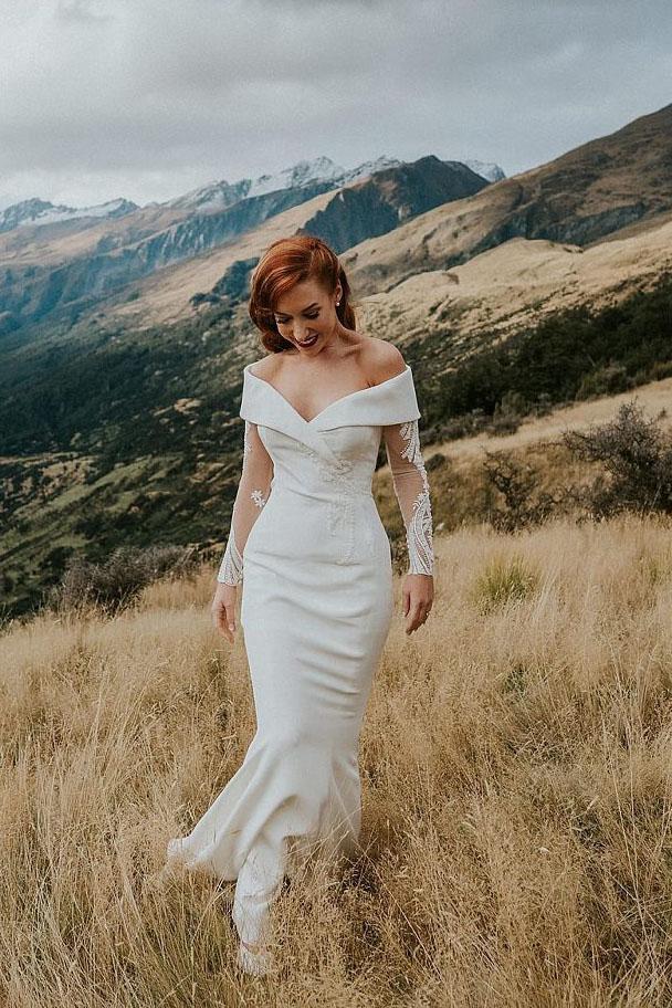 Charming Off the Shoulder Long Sleeves V Neck Mermaid Wedding Dresses, Bridal Dresses SRS15116