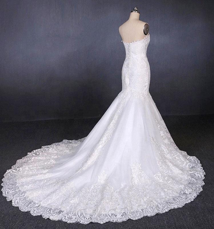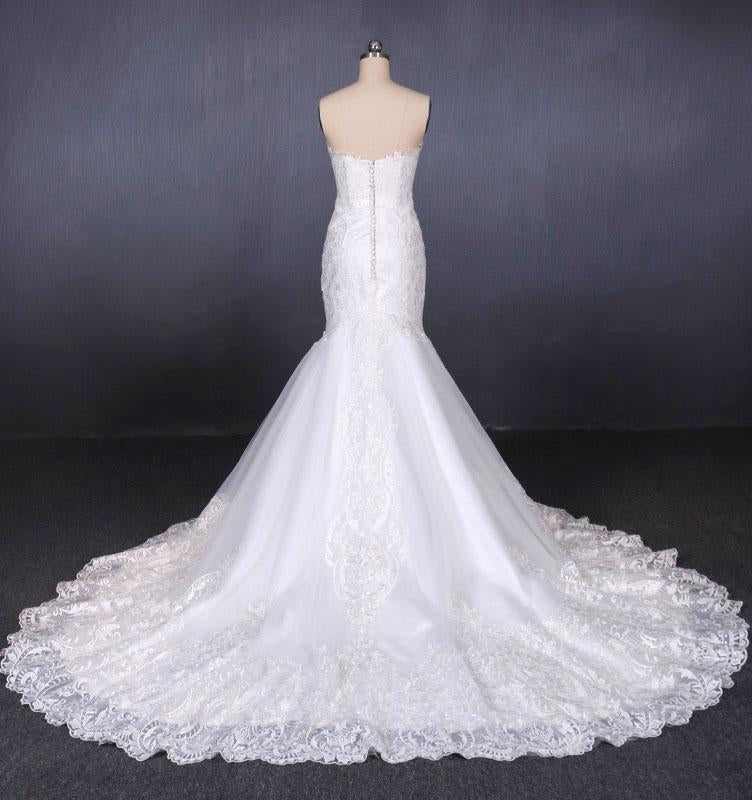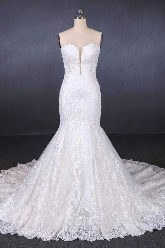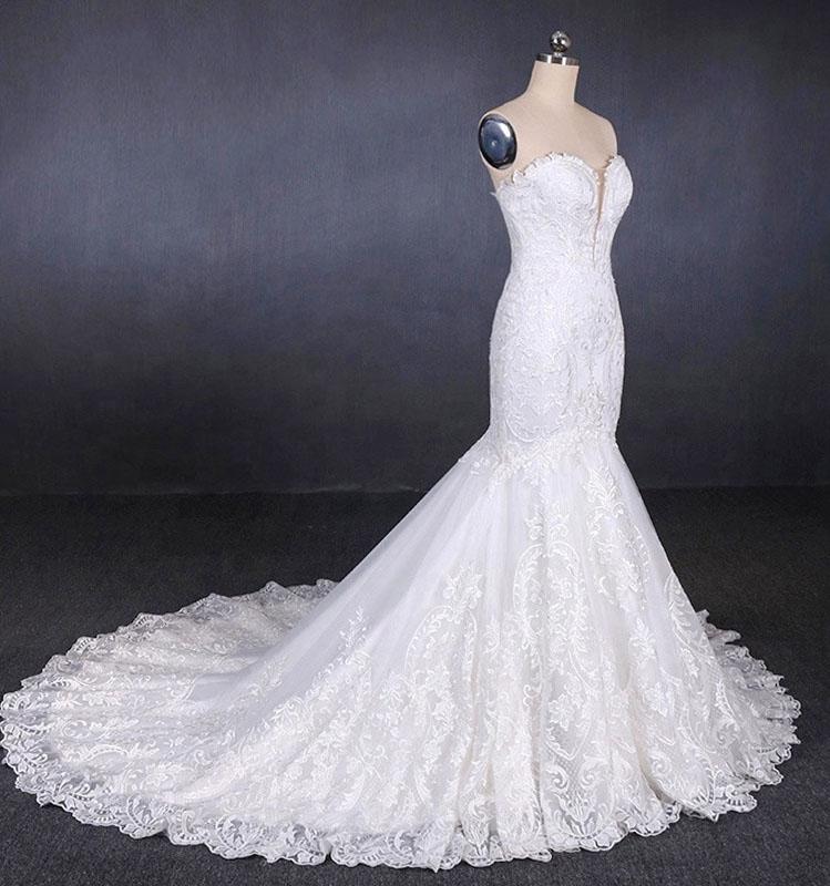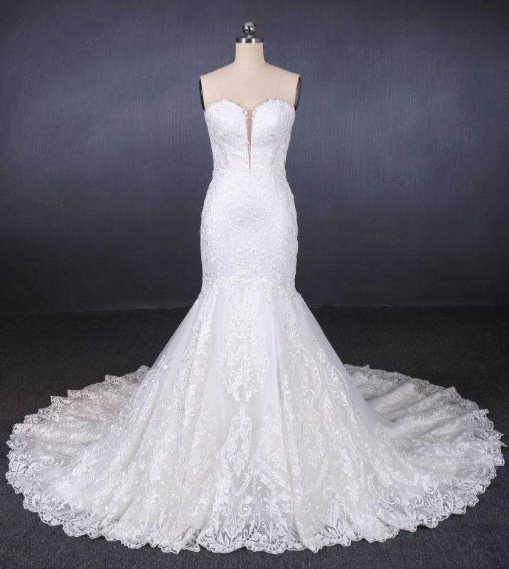 Charming Strapless Sweetheart Mermaid Lace Appliques White Wedding Dresses SRS15128