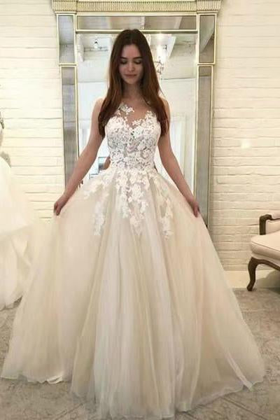 Chic Ivory Lace Appliques Straps Wedding Dresses with Tulle Cheap Prom Dresses P1025
