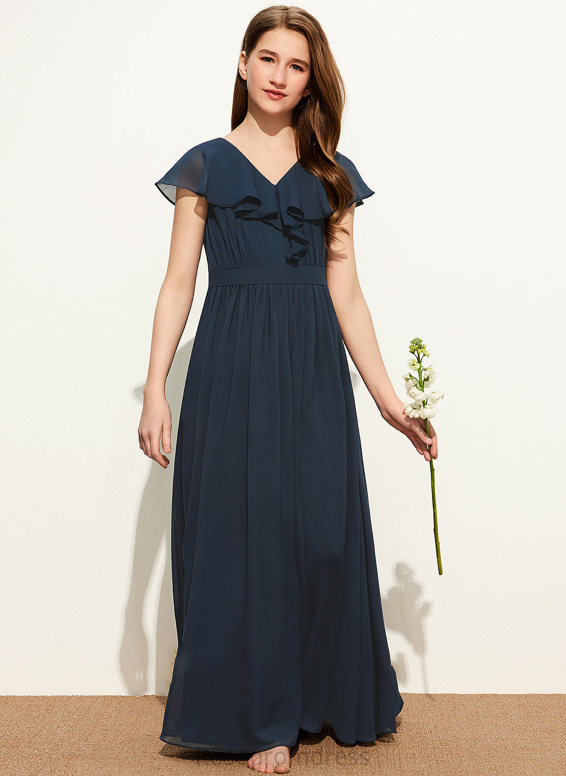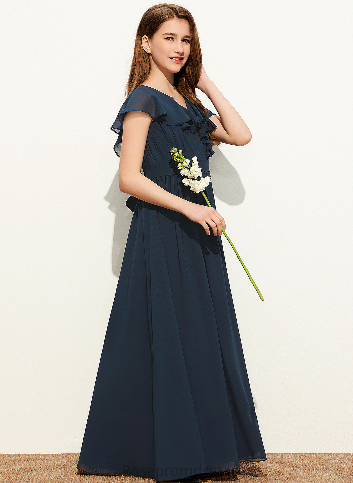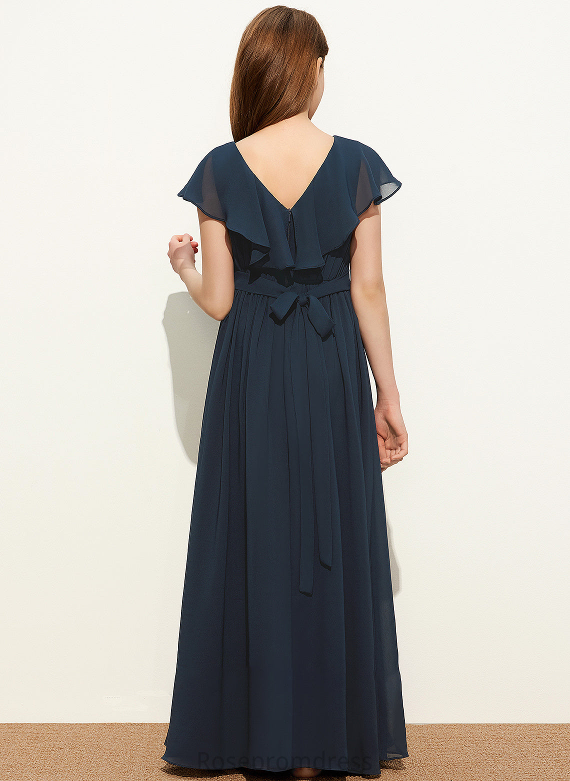 Chloe Junior Bridesmaid Dresses Cascading Floor-Length Bow(s) Ruffles A-Line With V-neck Chiffon
