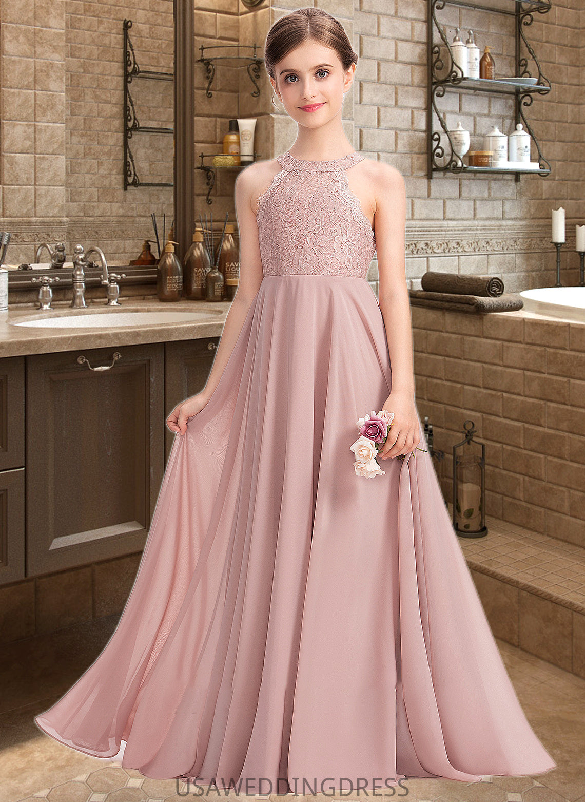 Christine A-Line Scoop Neck Floor-Length Chiffon Lace Junior Bridesmaid Dress DSP0013324