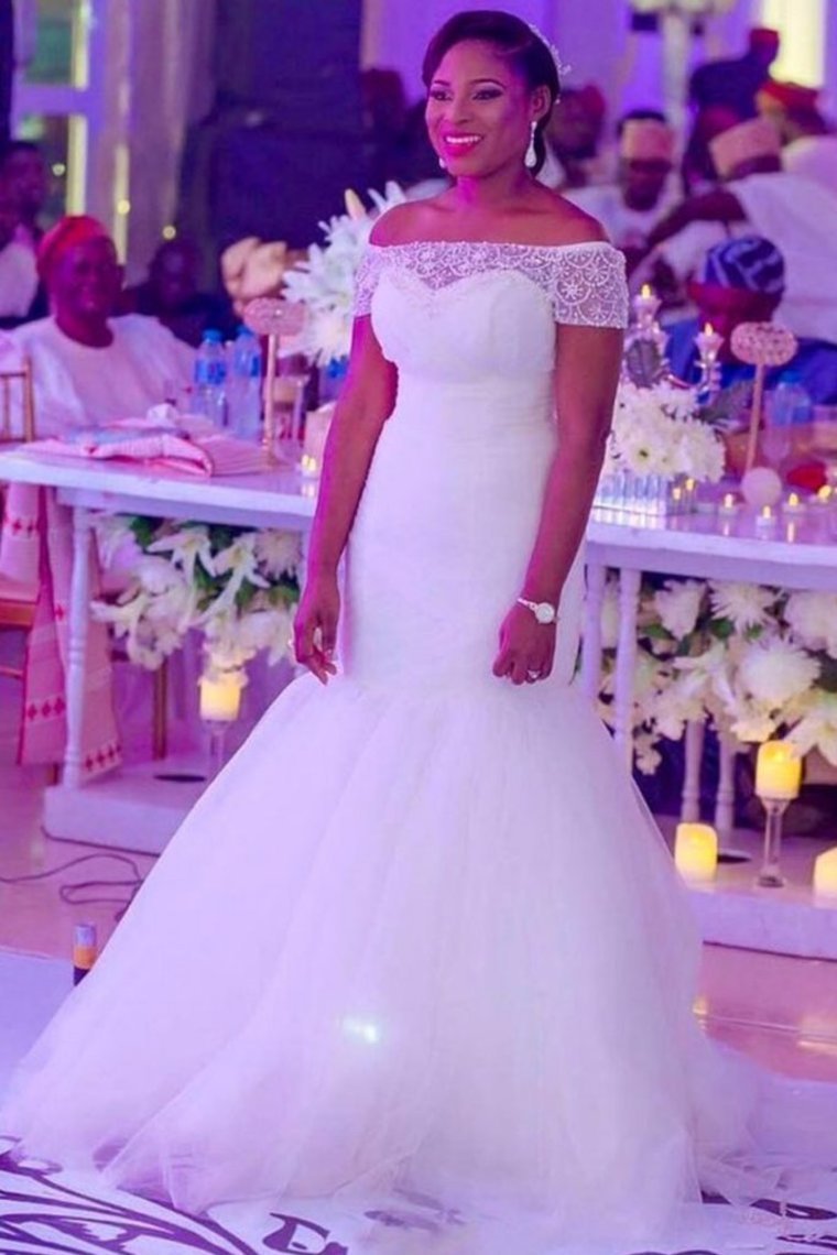 Classy Boat Neckline Long Mermaid Sheath Ivory Tulle Wedding Dresses