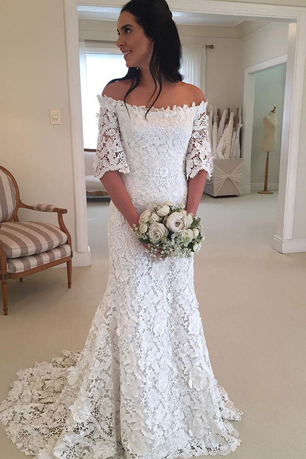 Classy Half Sleeve Off the Shoulder Lace Wedding Dresses