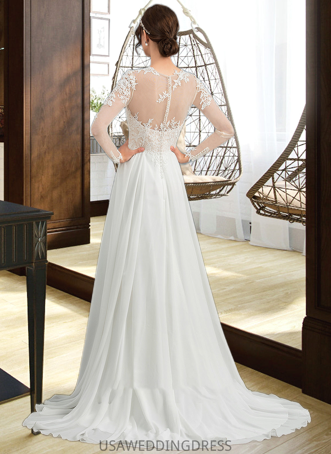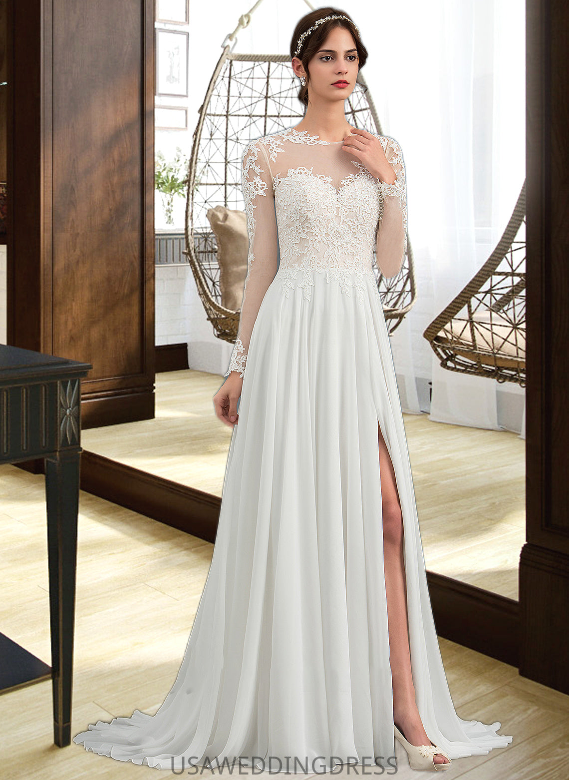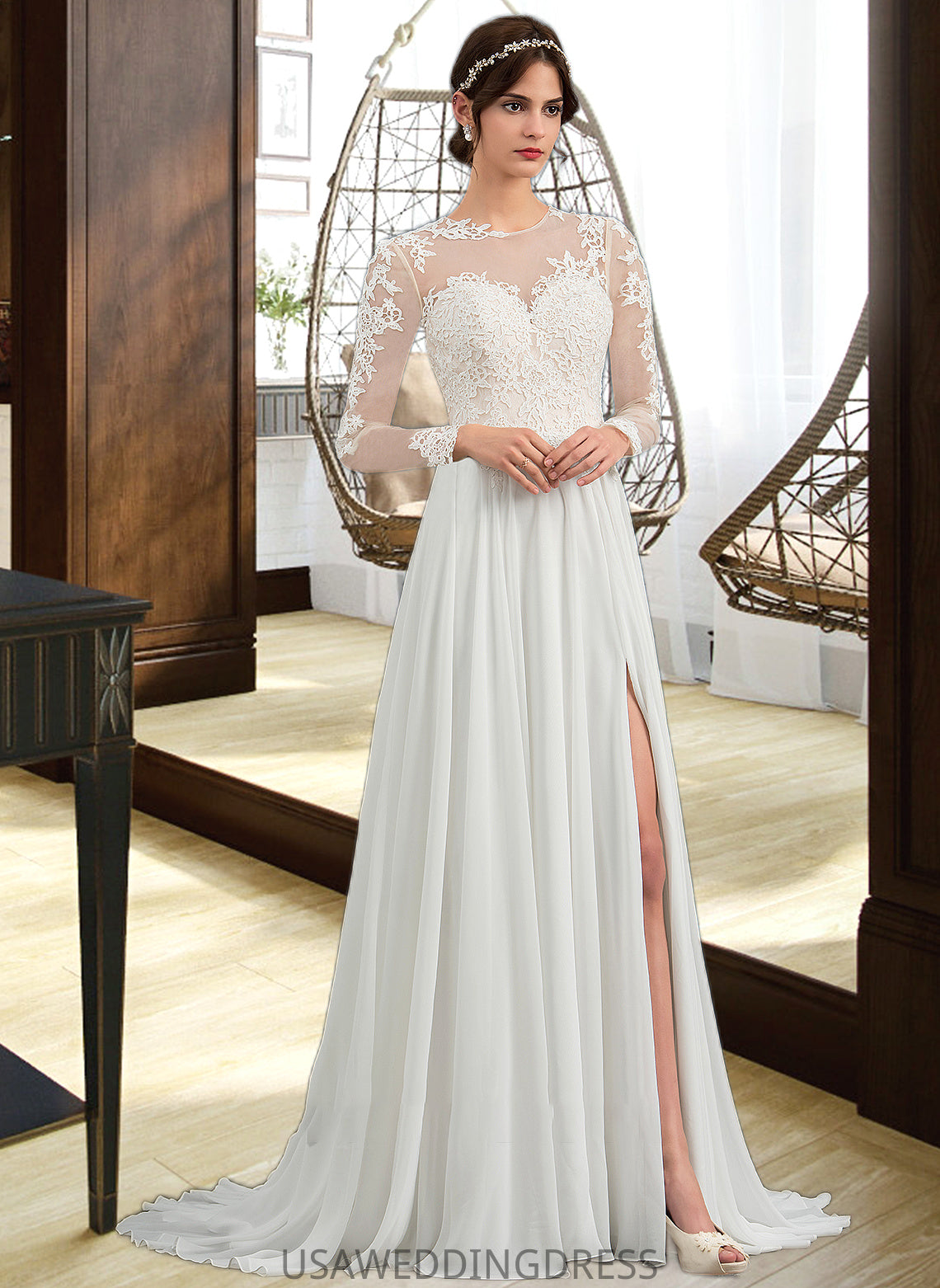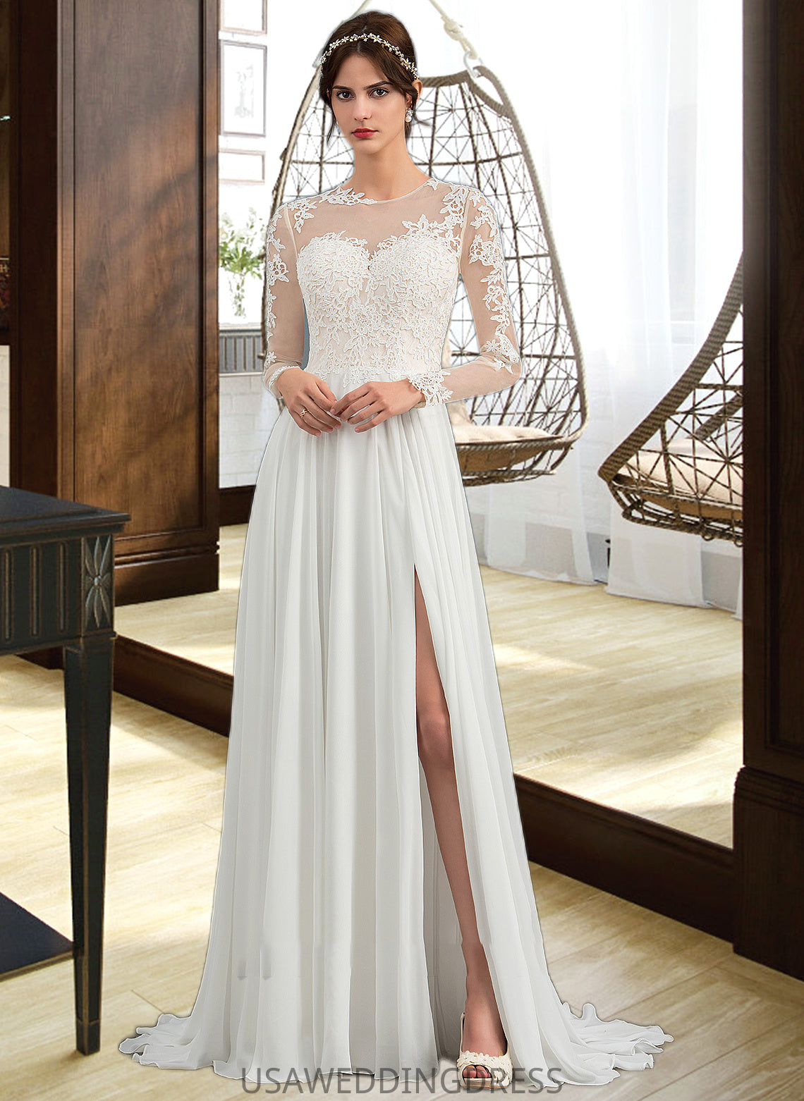 Coral A-Line Illusion Sweep Train Chiffon Wedding Dress With Appliques Lace Split Front DSP0013793