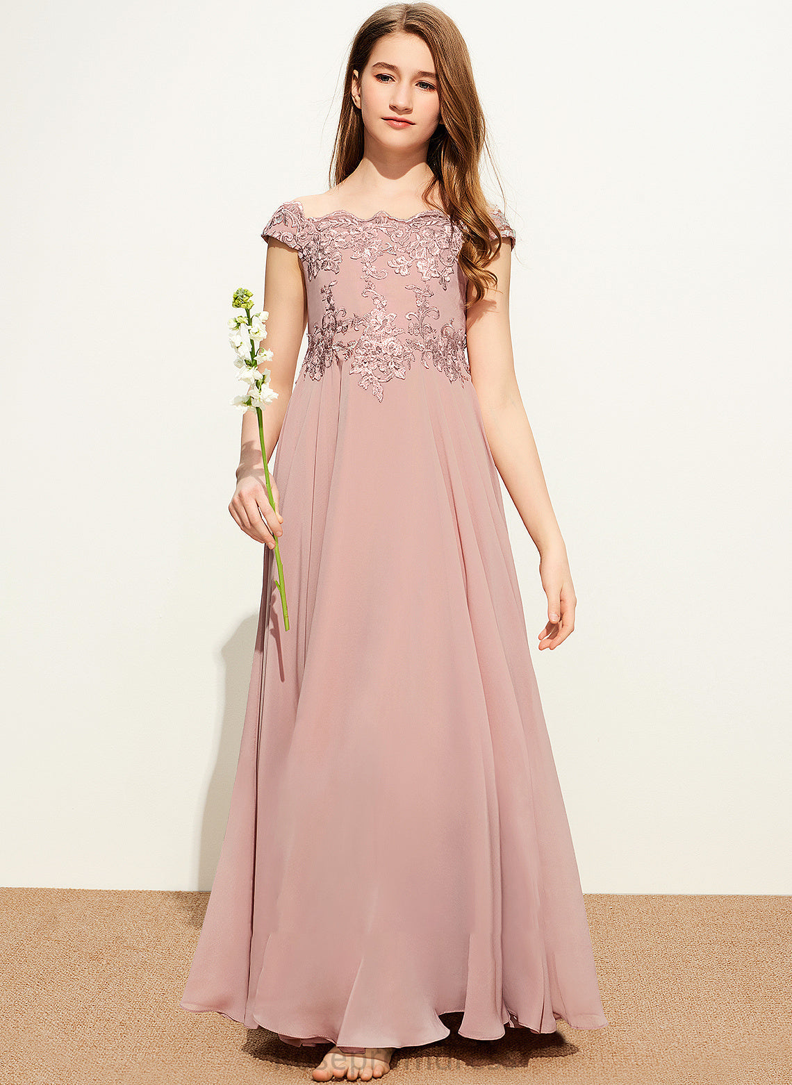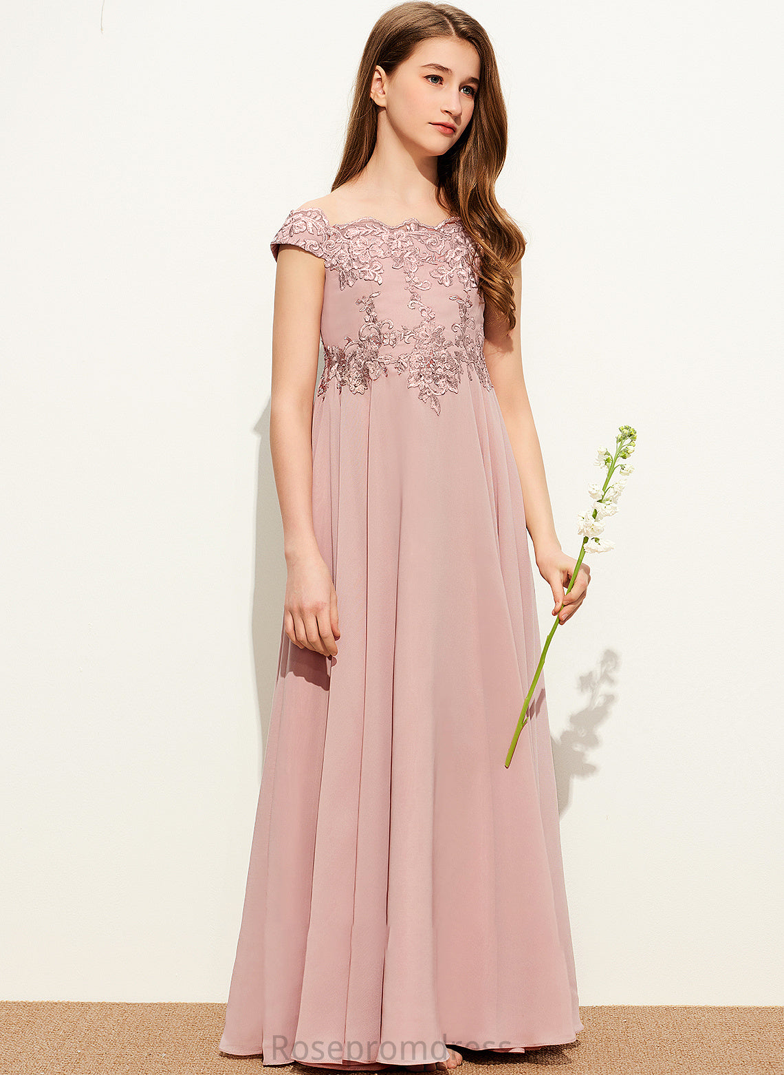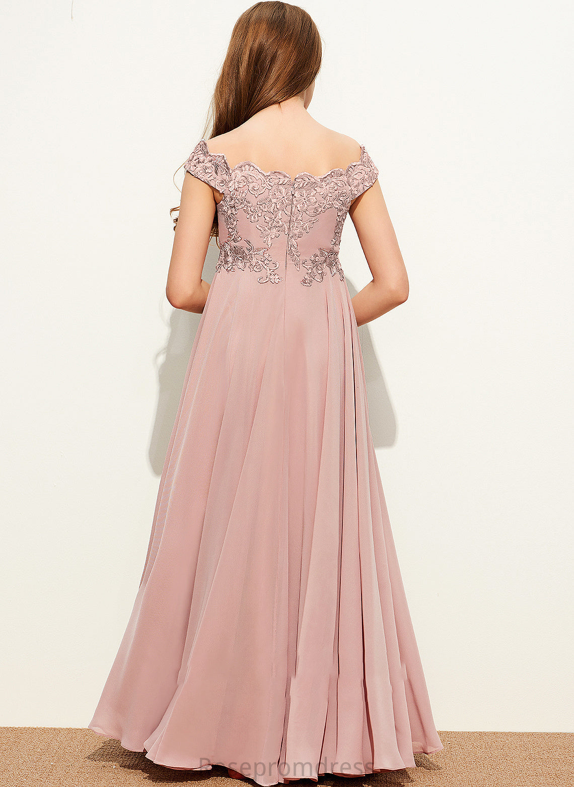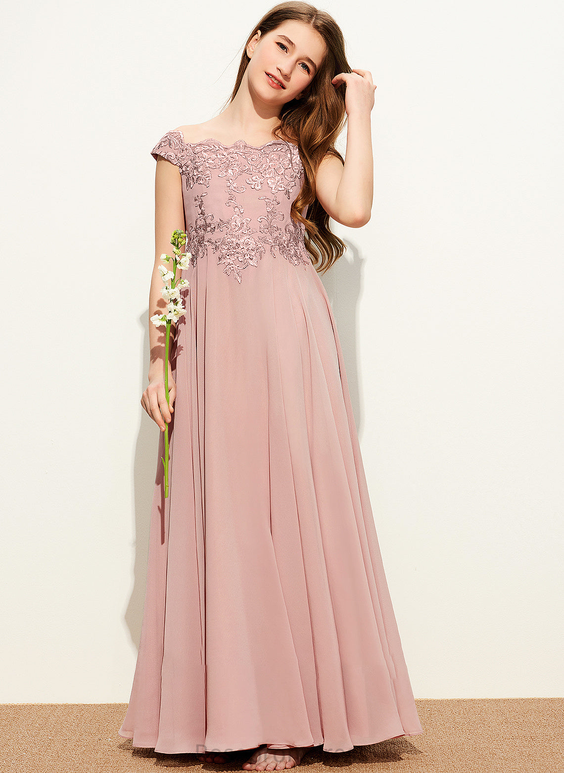 Cristal A-Line Floor-Length Chiffon Lace Off-the-Shoulder Junior Bridesmaid Dresses