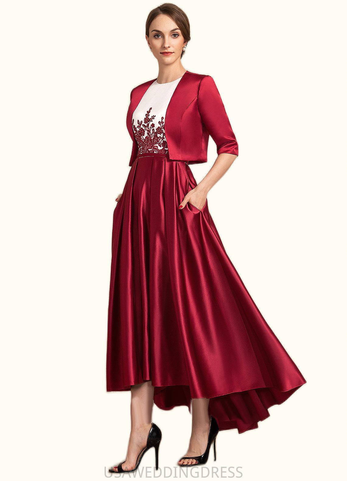 Dahlia A-Line Scoop Neck Asymmetrical Satin Lace Mother of the Bride Dress With Ruffle Sequins Pockets DS126P0014853