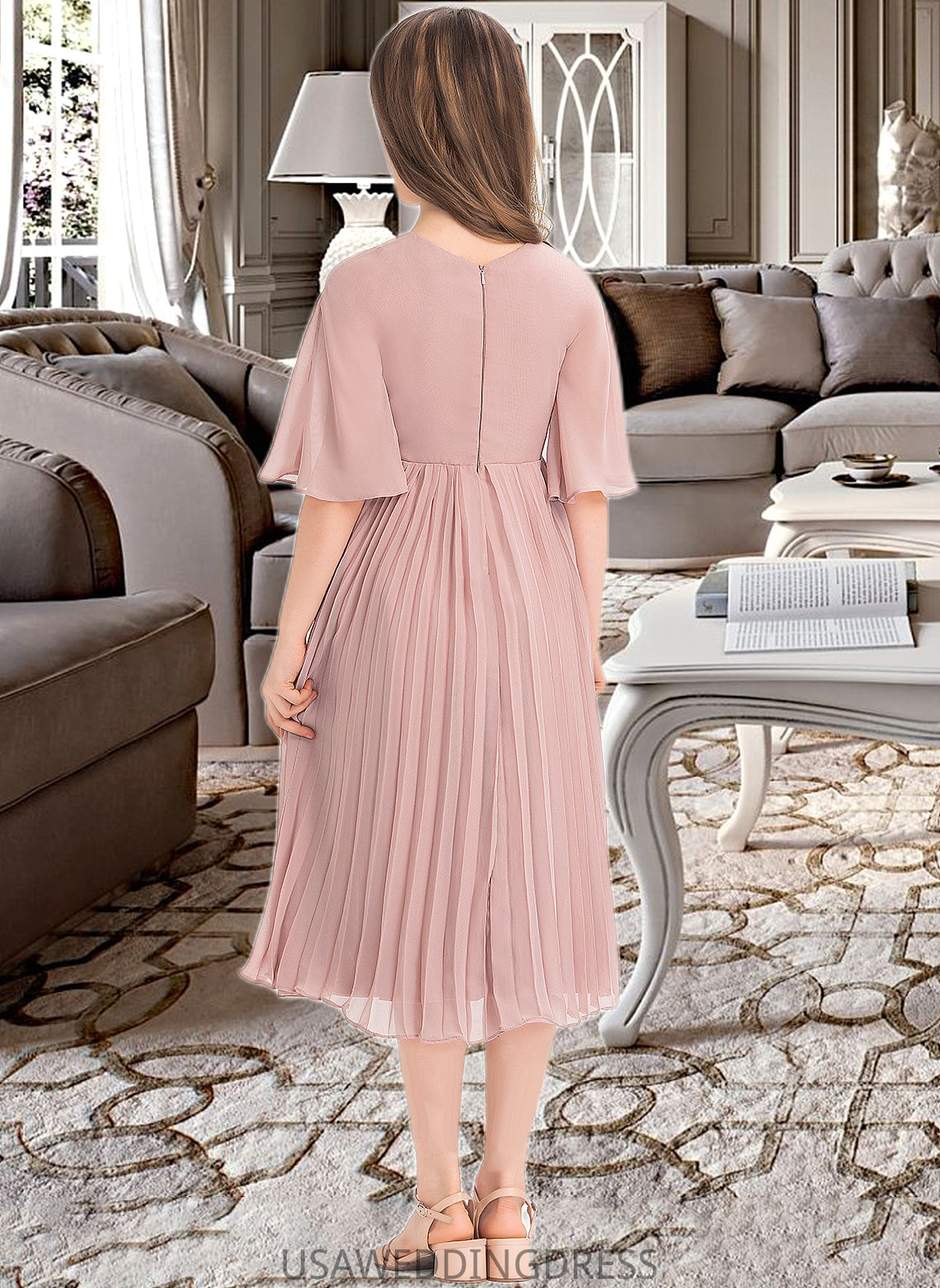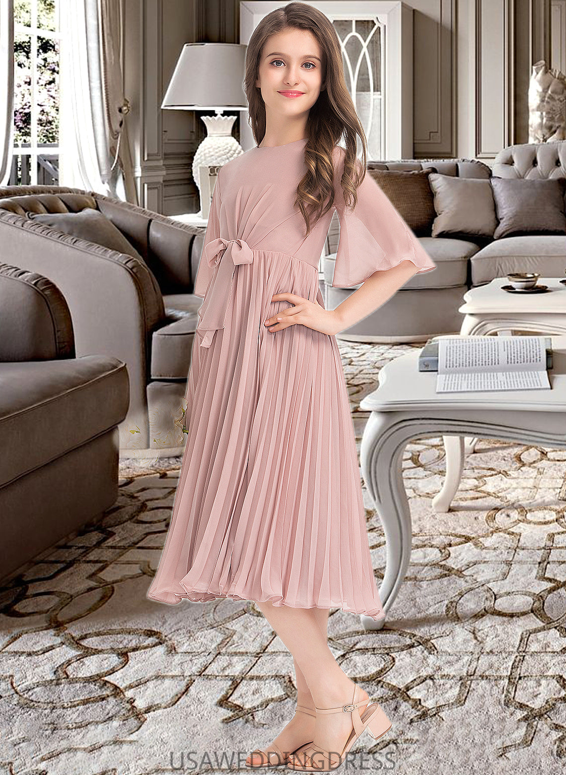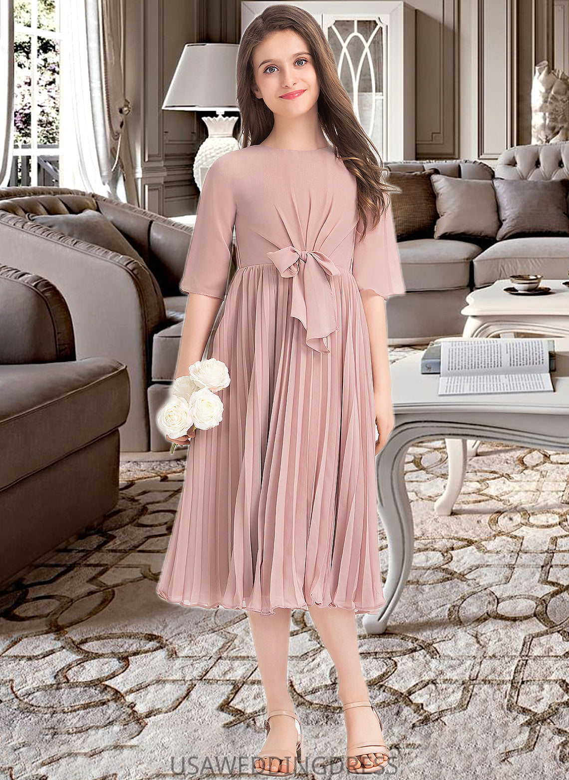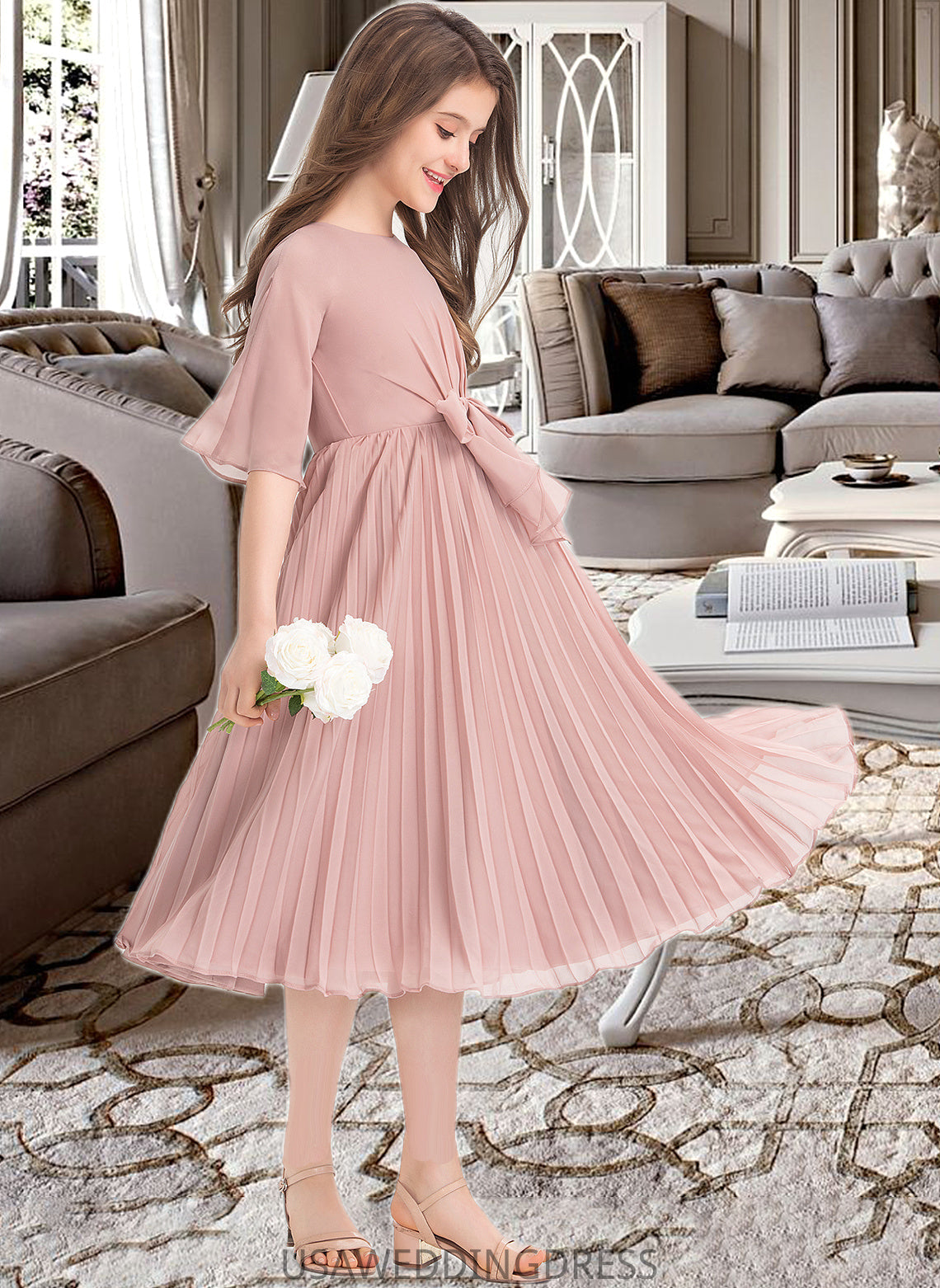 Dana A-Line Scoop Neck Knee-Length Chiffon Junior Bridesmaid Dress With Bow(s) Pleated DSP0013377