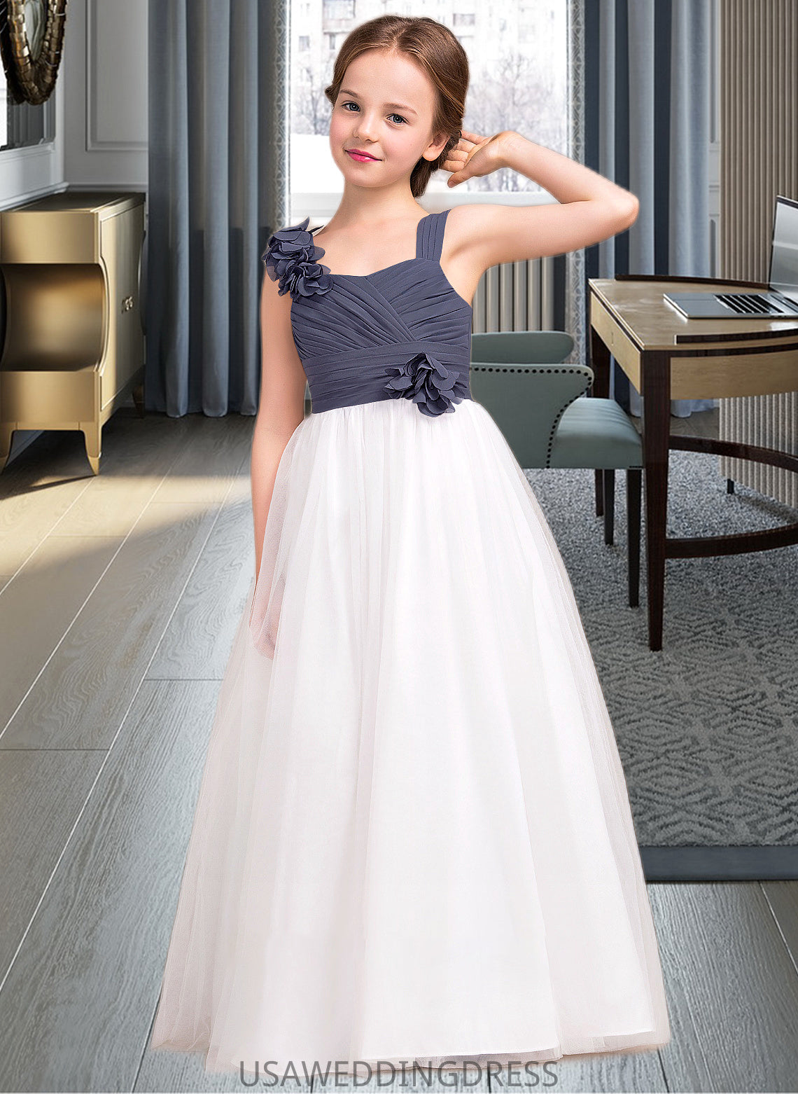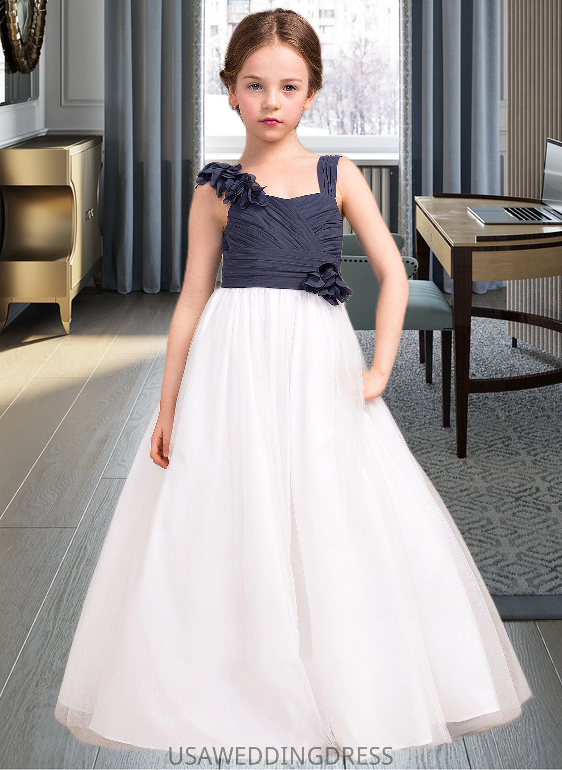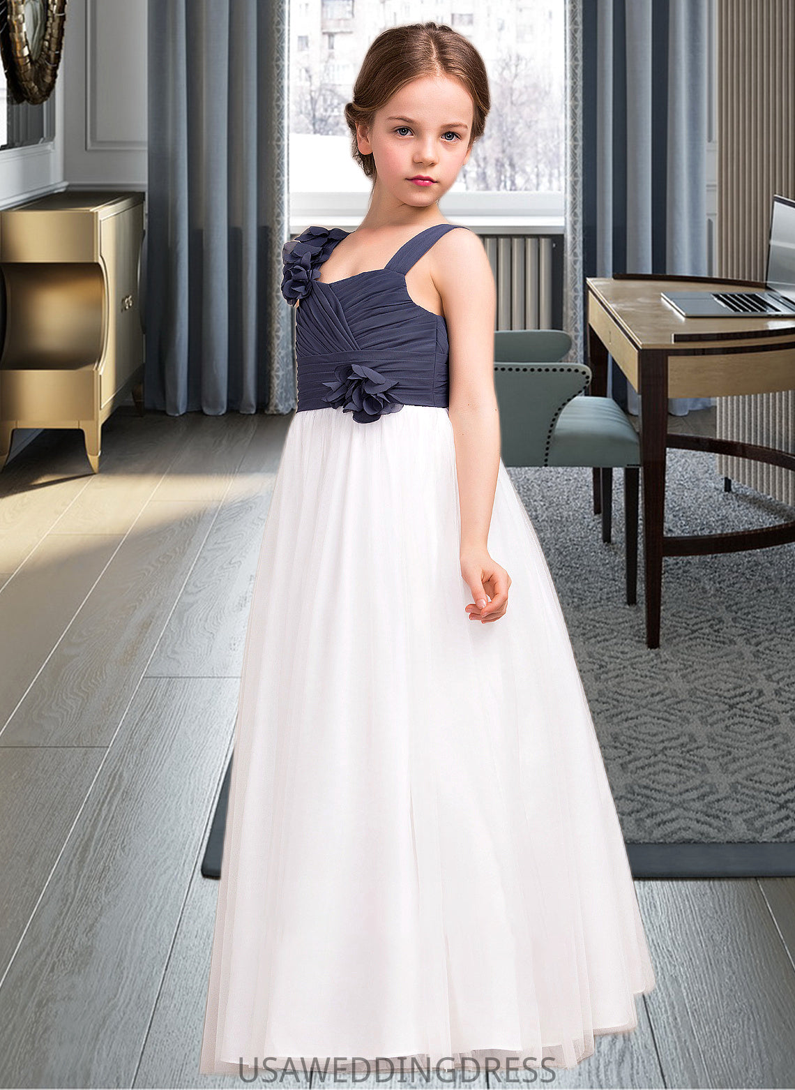 Deja A-Line Sweetheart Floor-Length Chiffon Tulle Junior Bridesmaid Dress With Ruffle Flower(s) DSP0013665