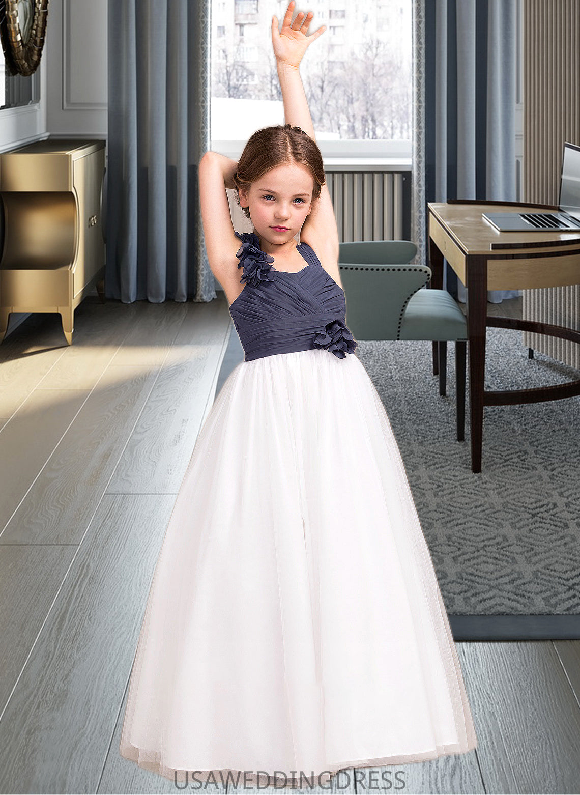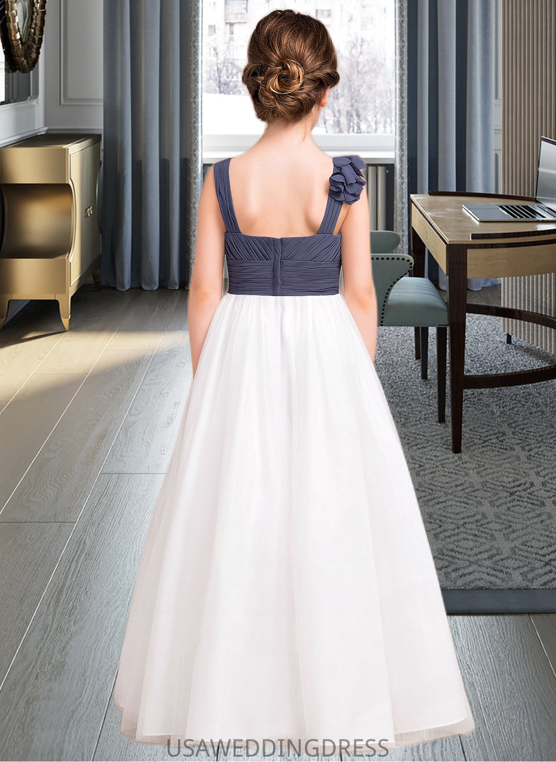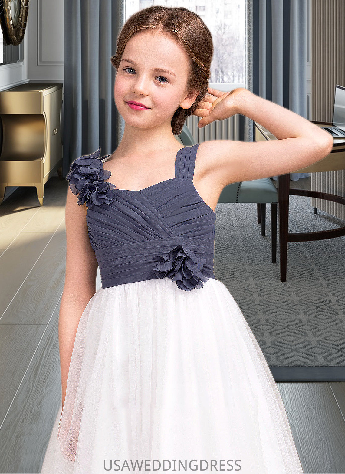 Deja A-Line Sweetheart Floor-Length Chiffon Tulle Junior Bridesmaid Dress With Ruffle Flower(s) DSP0013665