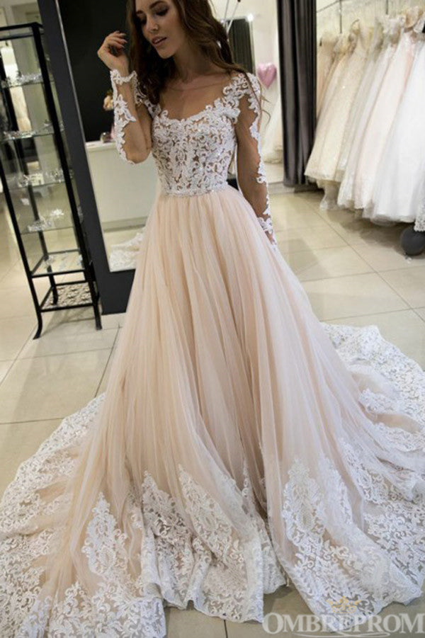 Delicate Long Sleeves A Line Lace Wedding Dresses with Appliques