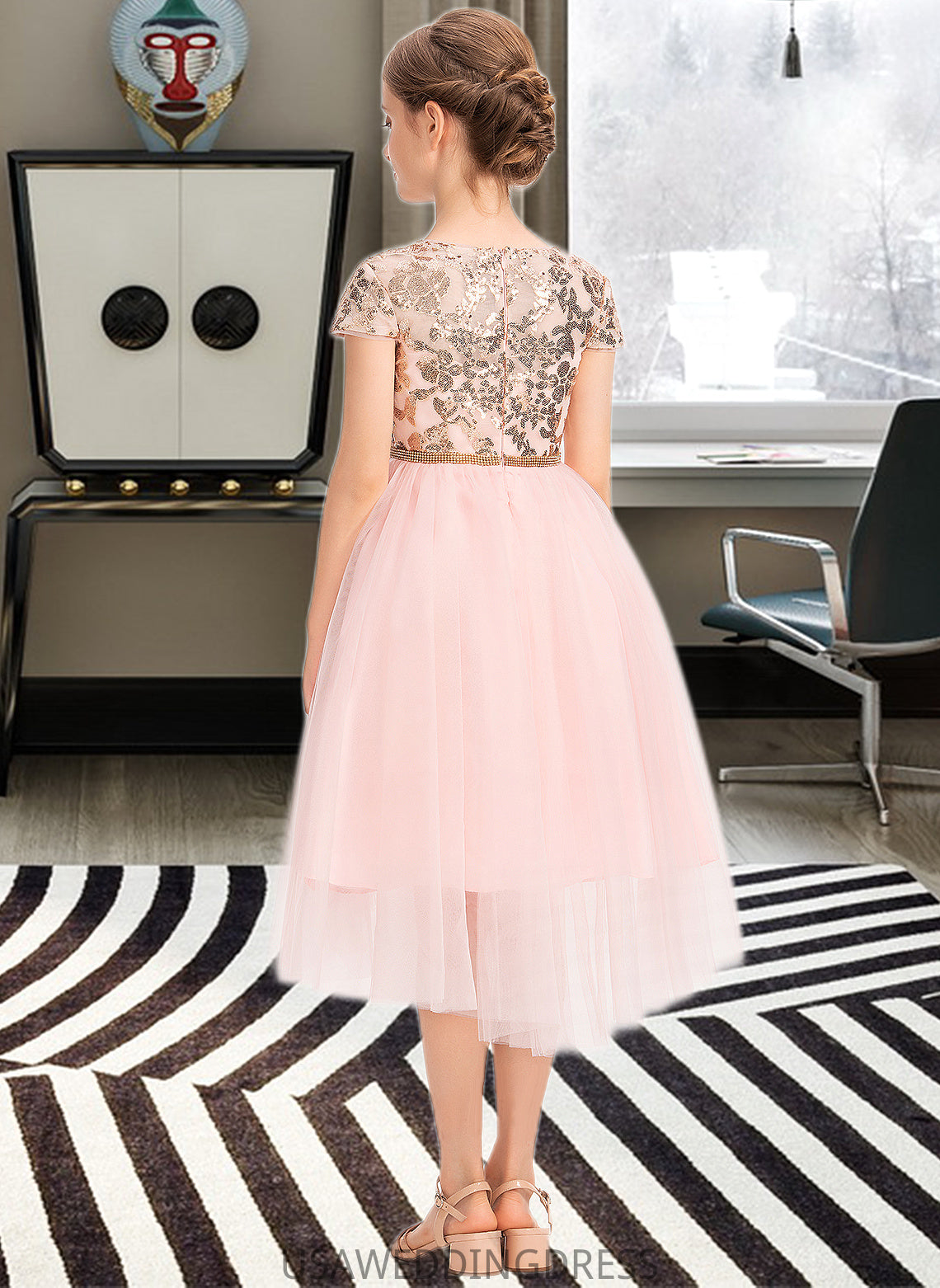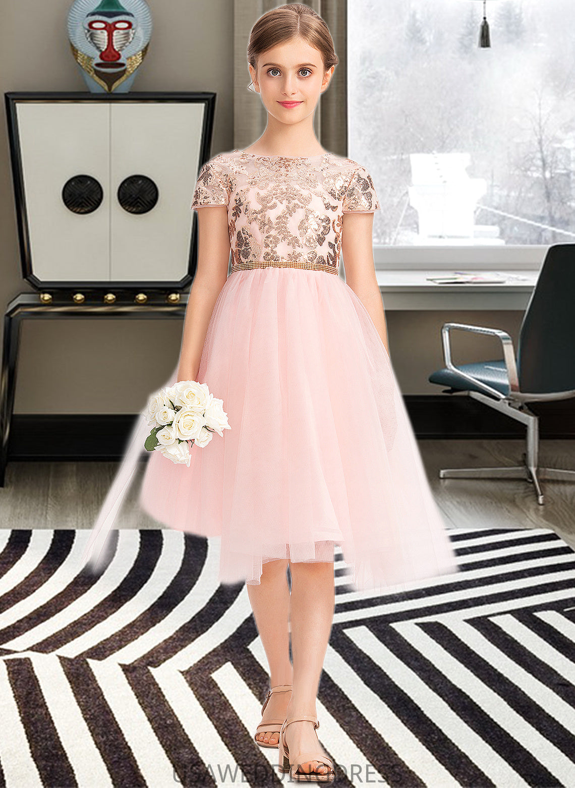 Destinee A-Line Scoop Neck Asymmetrical Tulle Junior Bridesmaid Dress With Sequins DSP0013531