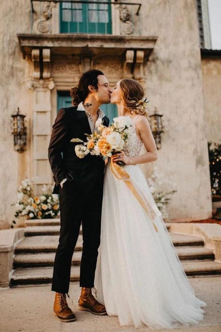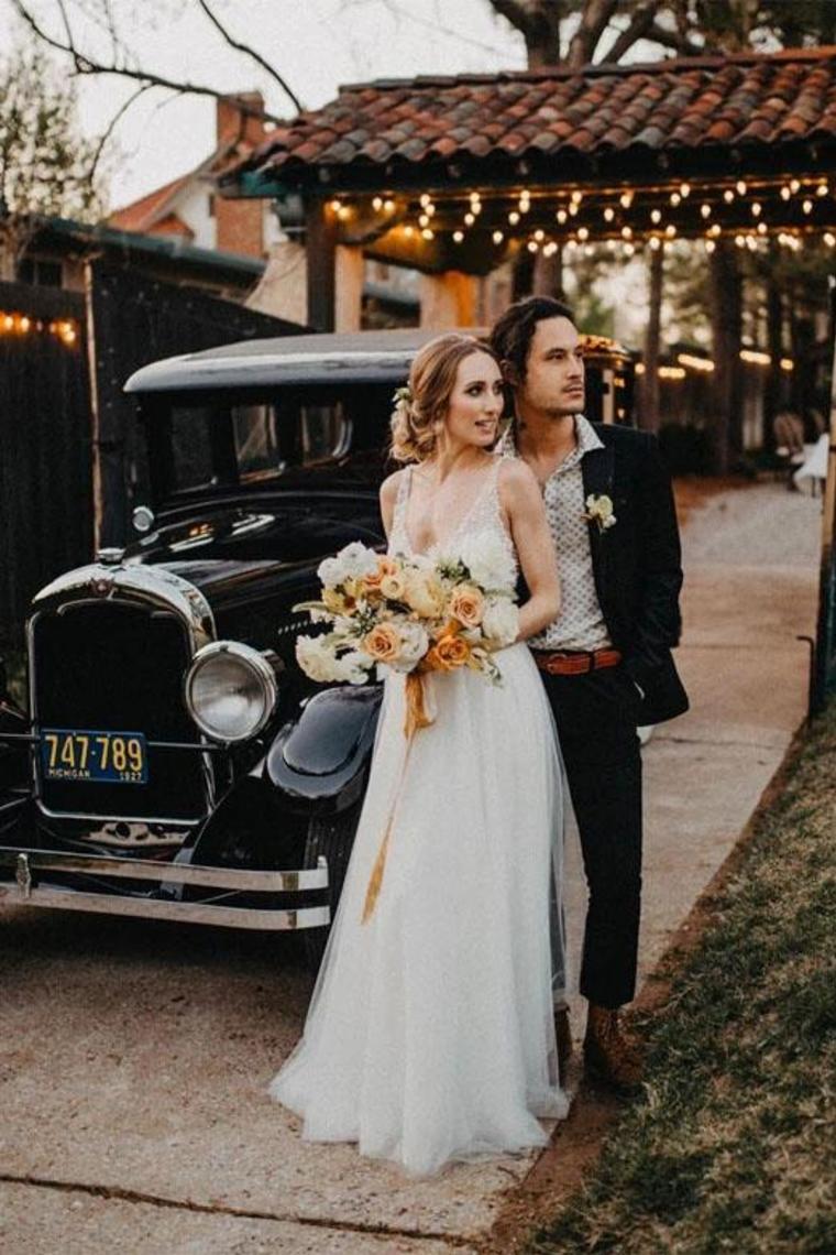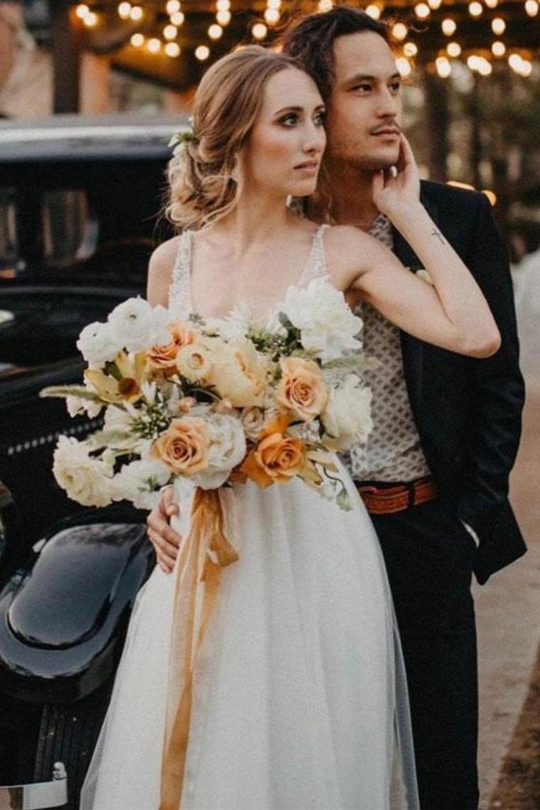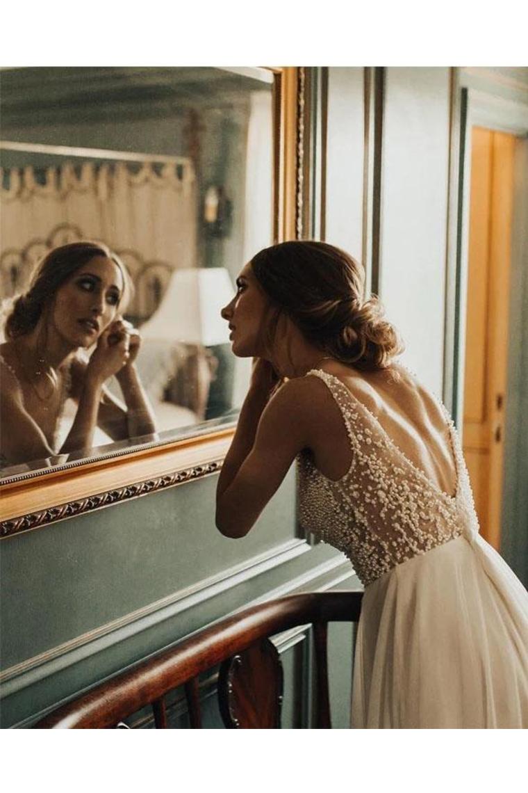 Elegant A Line Tulle Ivory V Neck Wedding Dresses With Pearls V Back Beach Bridal SRSPJ5XYJAD