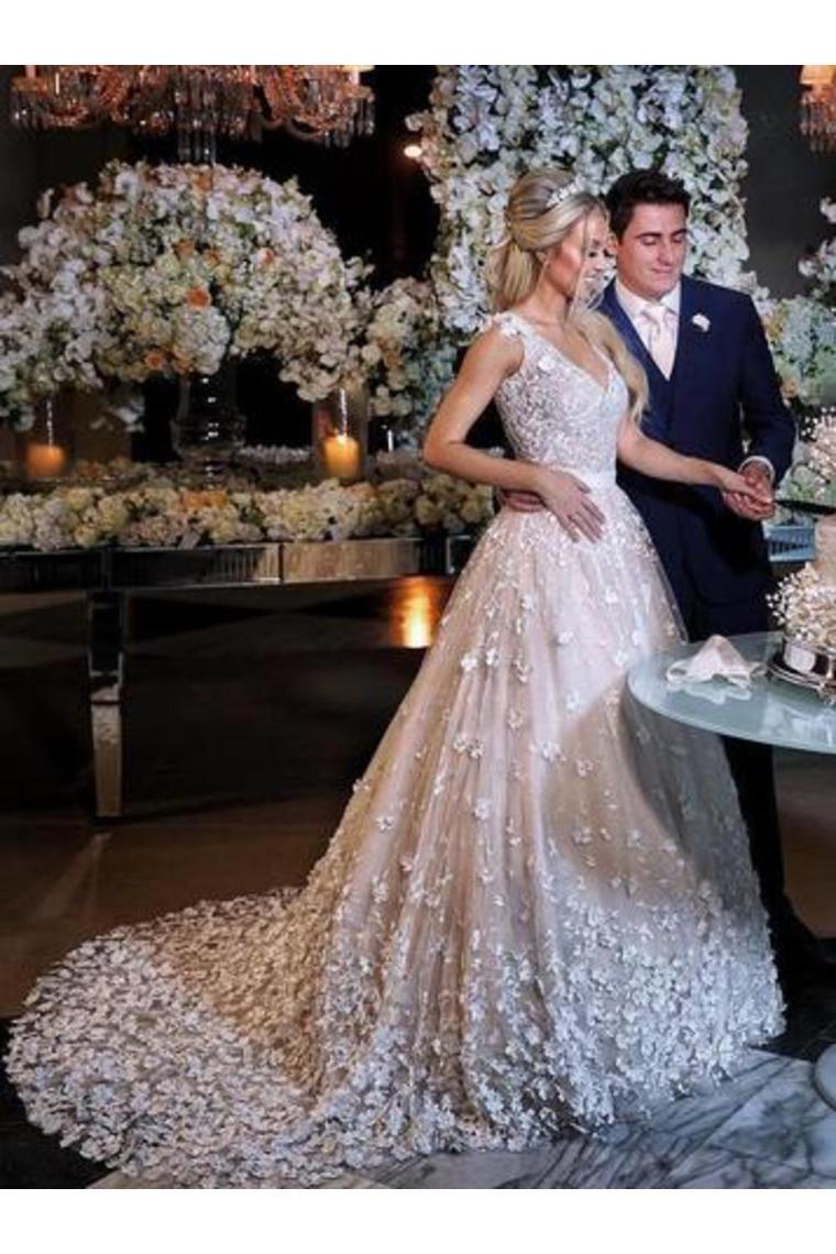 Elegant A-Line V-Neck Sweep Train Ivory Wedding Dress With Appliques
