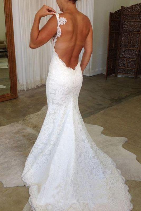 Elegant Mermaid Lace Backless V Neck Spaghetti Straps Wedding Dresses Bridal Dresses SRS15181