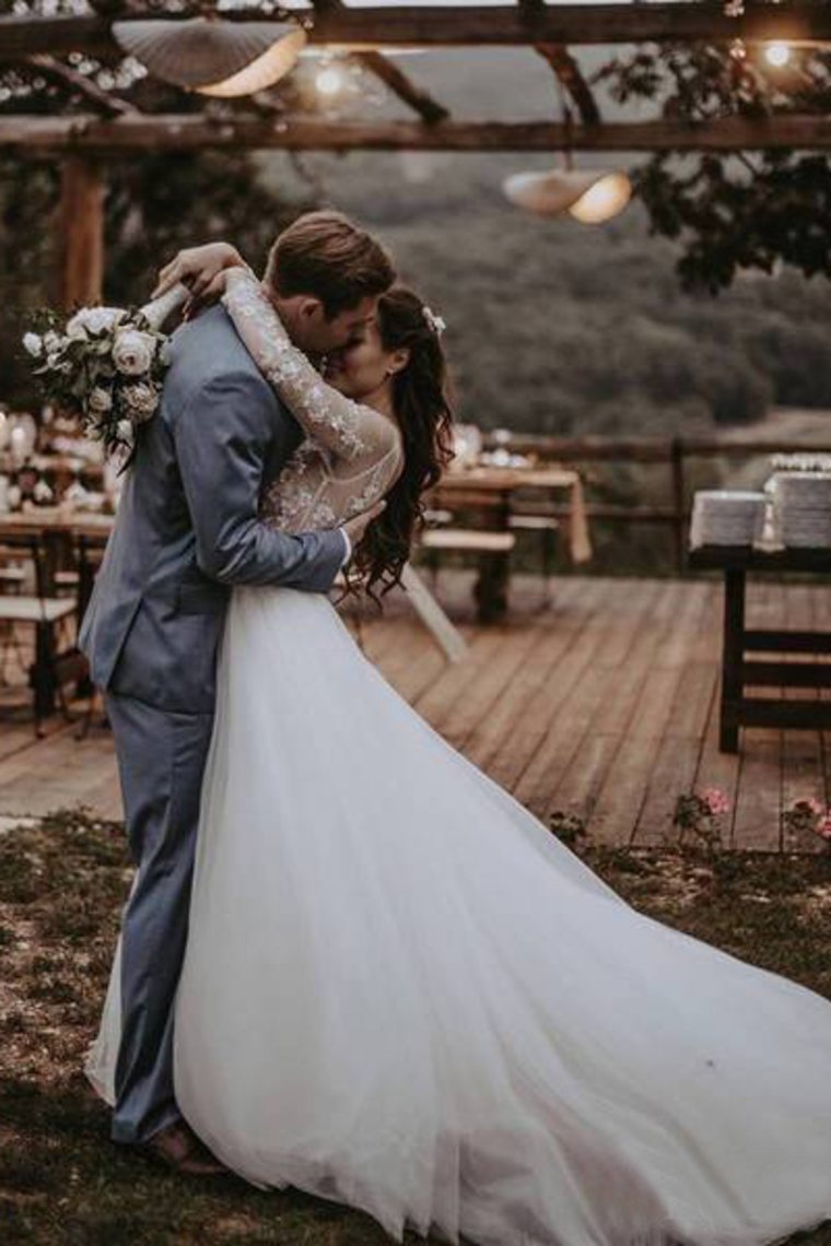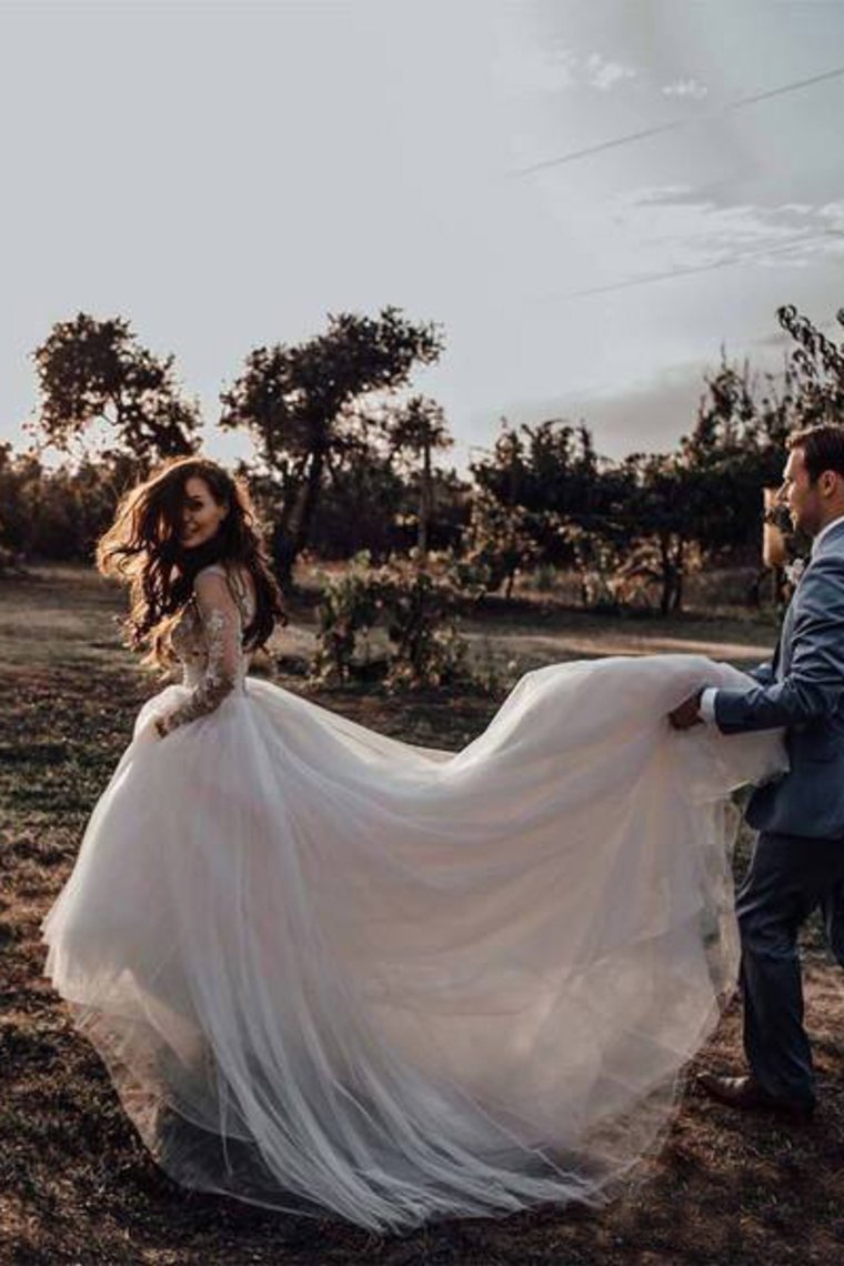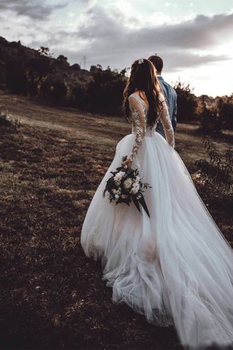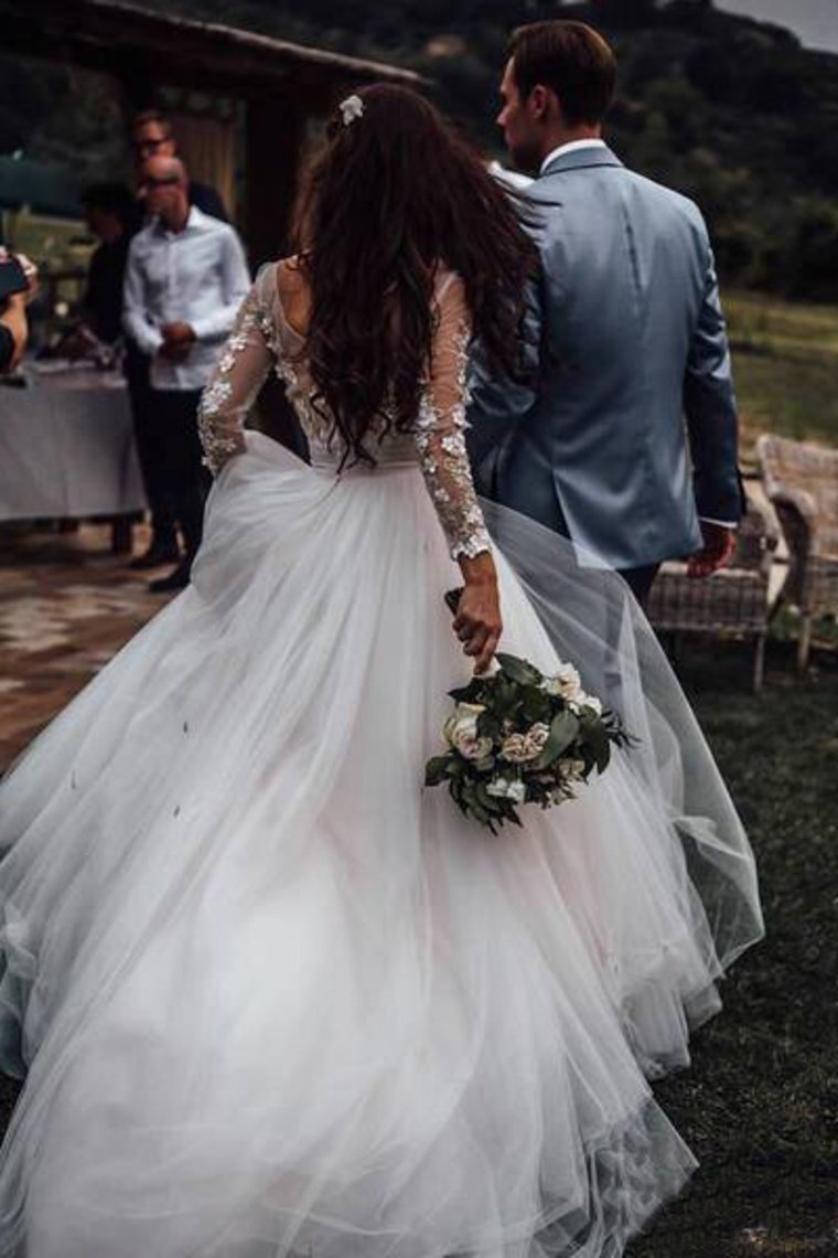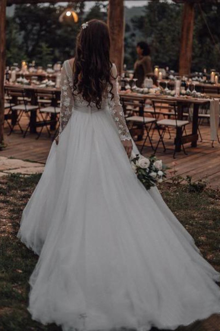 Elegant See Through Long Sleeve Wedding Dresses Lace Applique Bridal Dress