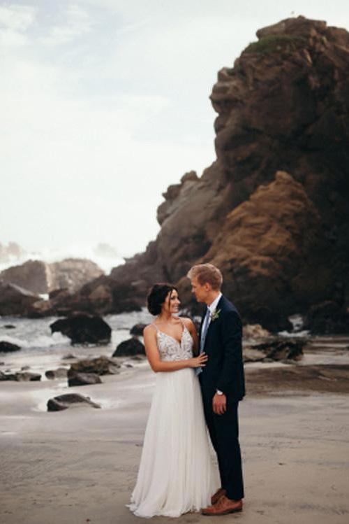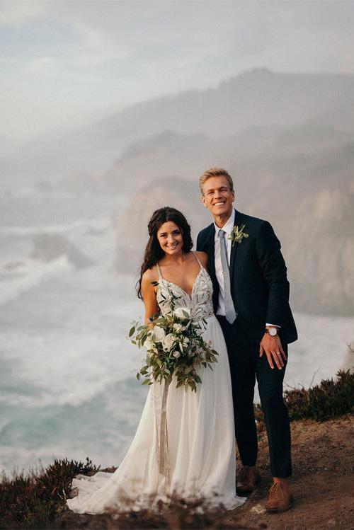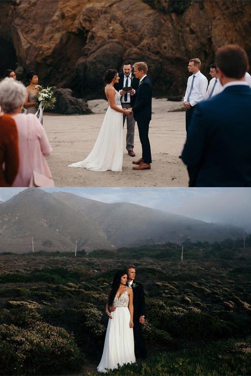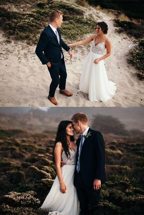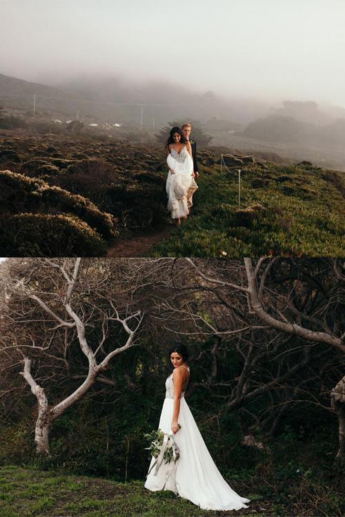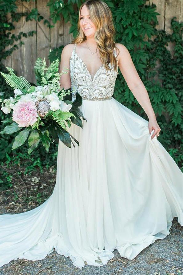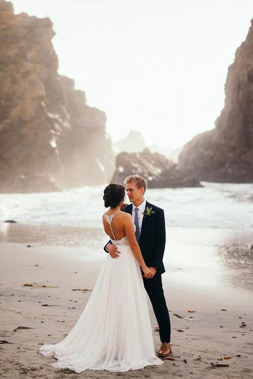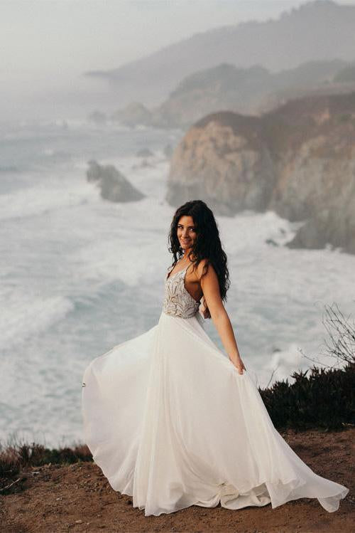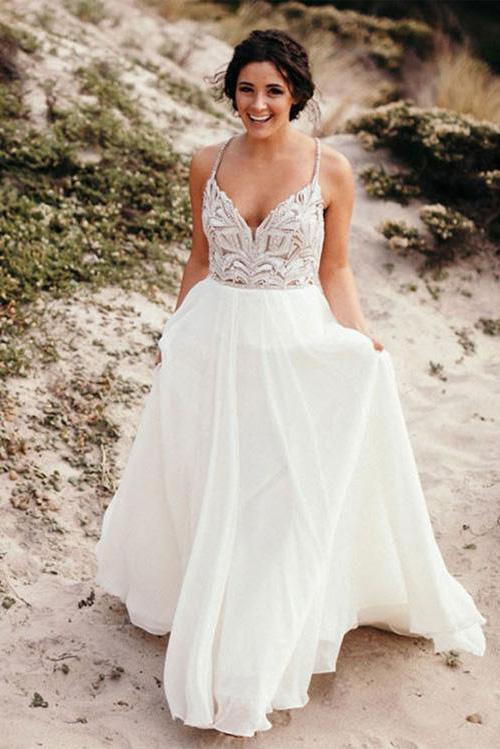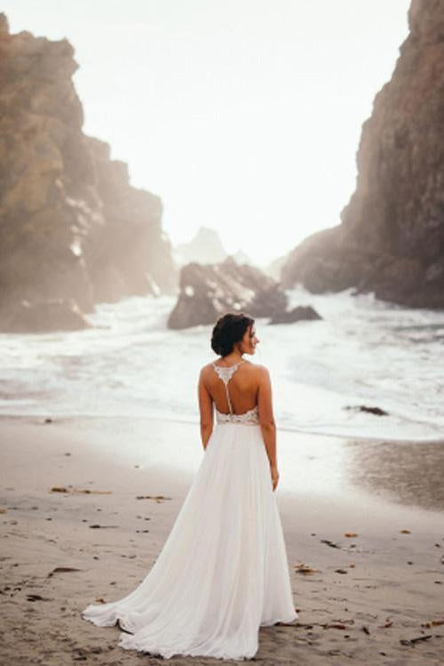 Elegant Spaghetti Straps V Neck Chiffon Backless Beach Wedding Dresses Bridal Gowns SRS14976