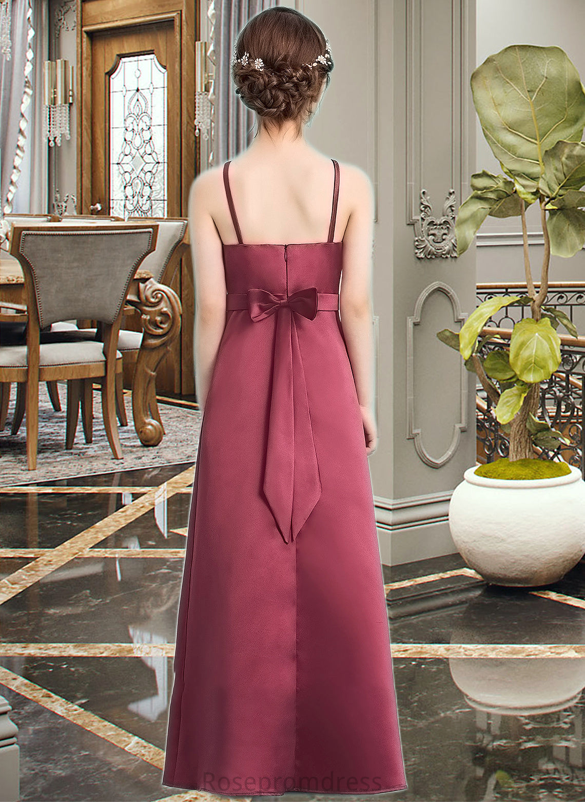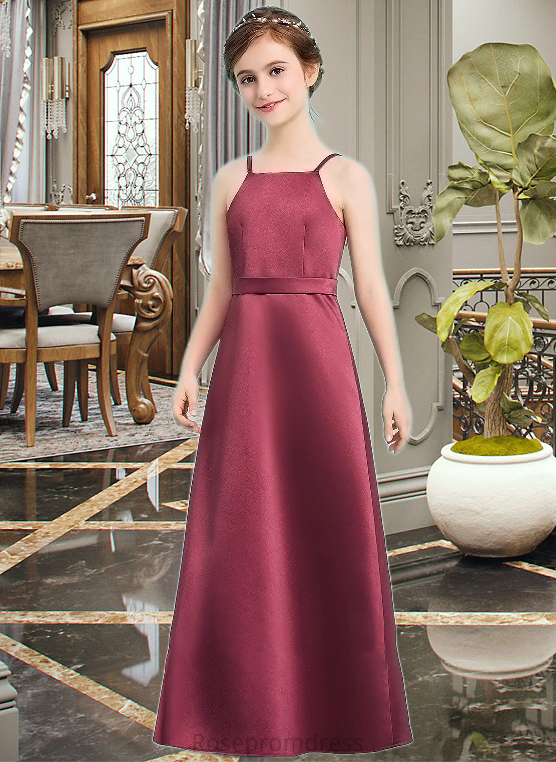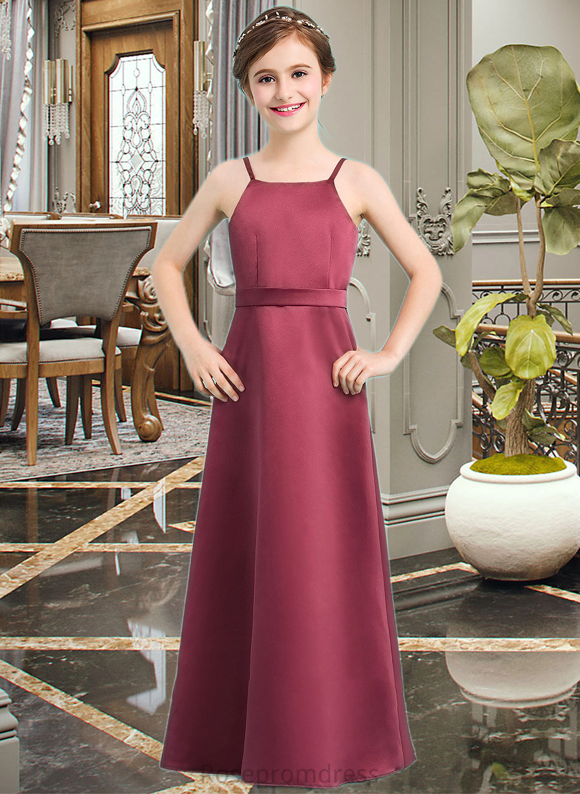 Elizabeth A-Line Square Neckline Floor-Length Satin Junior Bridesmaid Dress With Bow(s) SRSP0013585