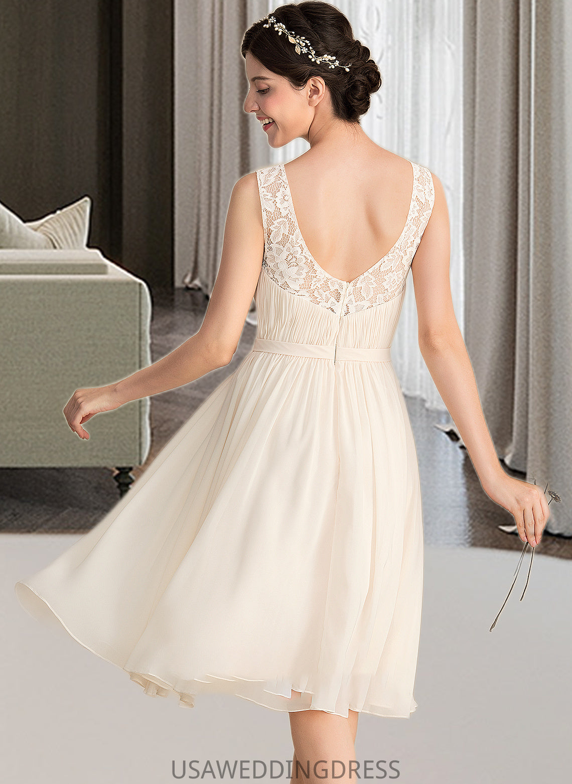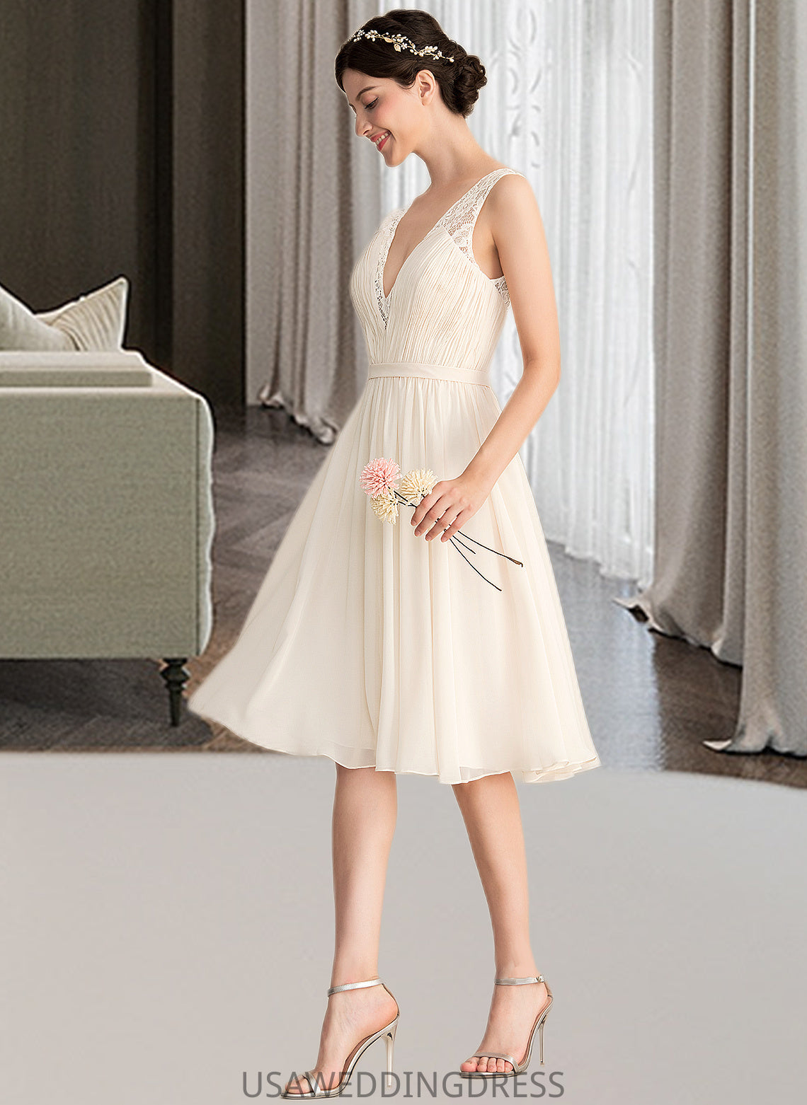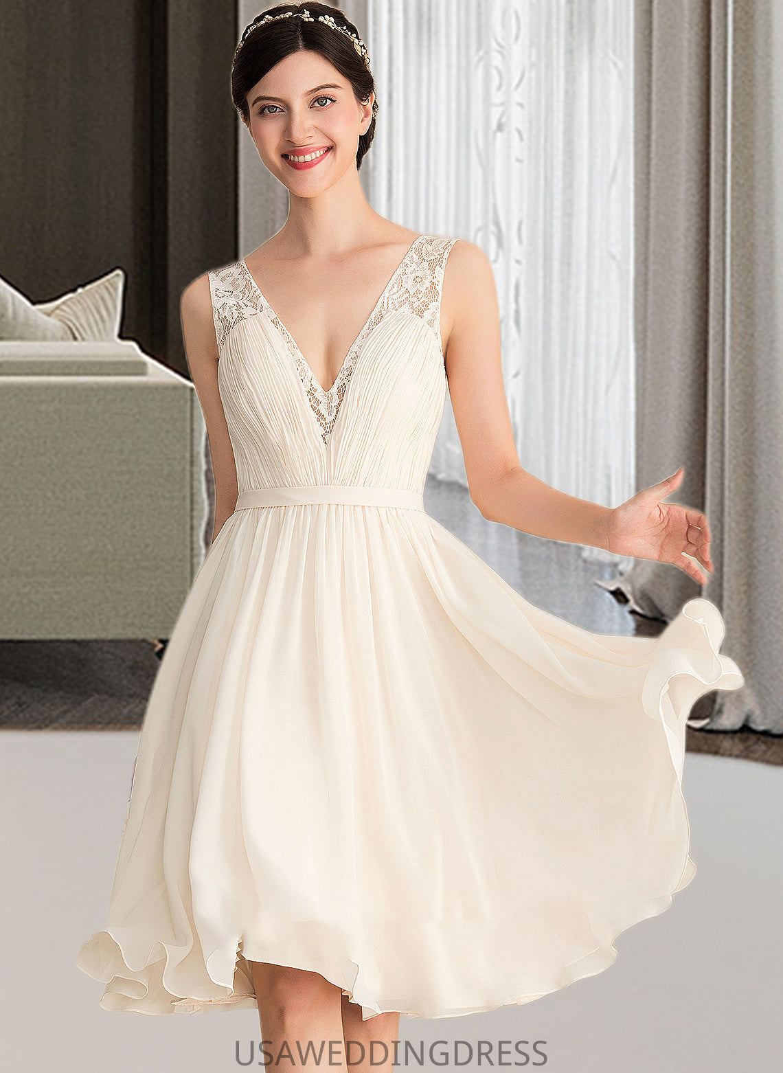 Elsa A-Line V-neck Knee-Length Chiffon Lace Wedding Dress With Ruffle DSP0013794