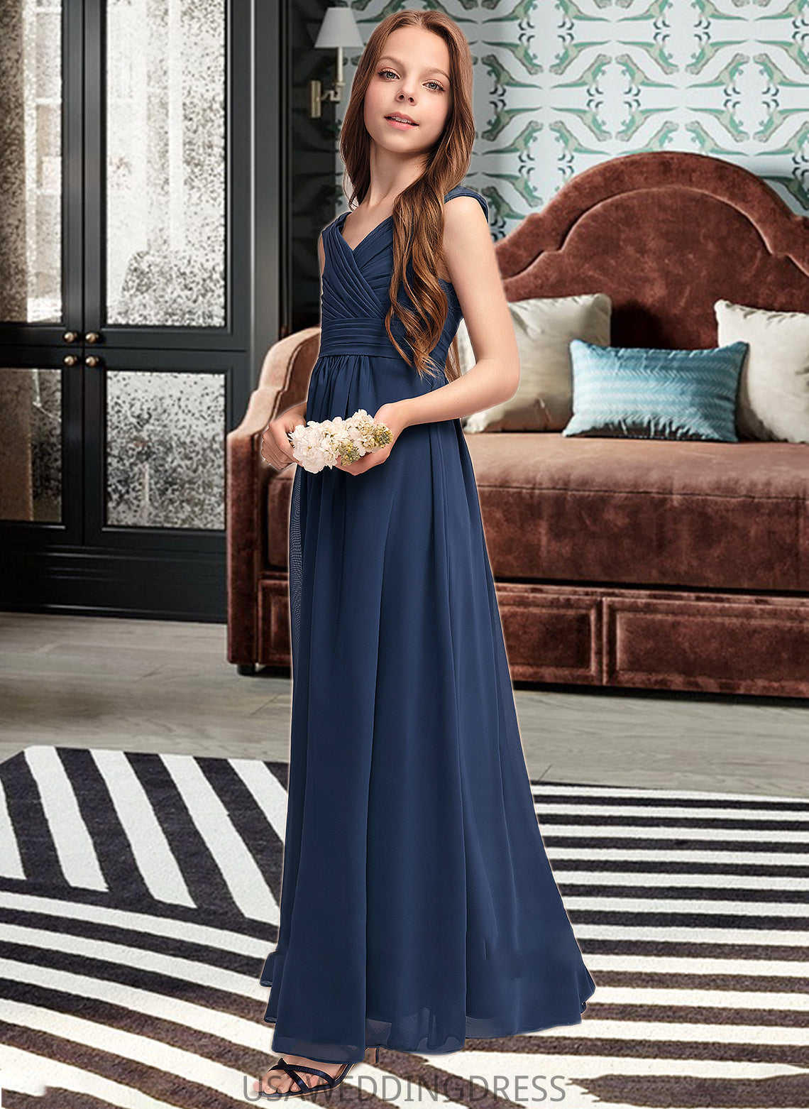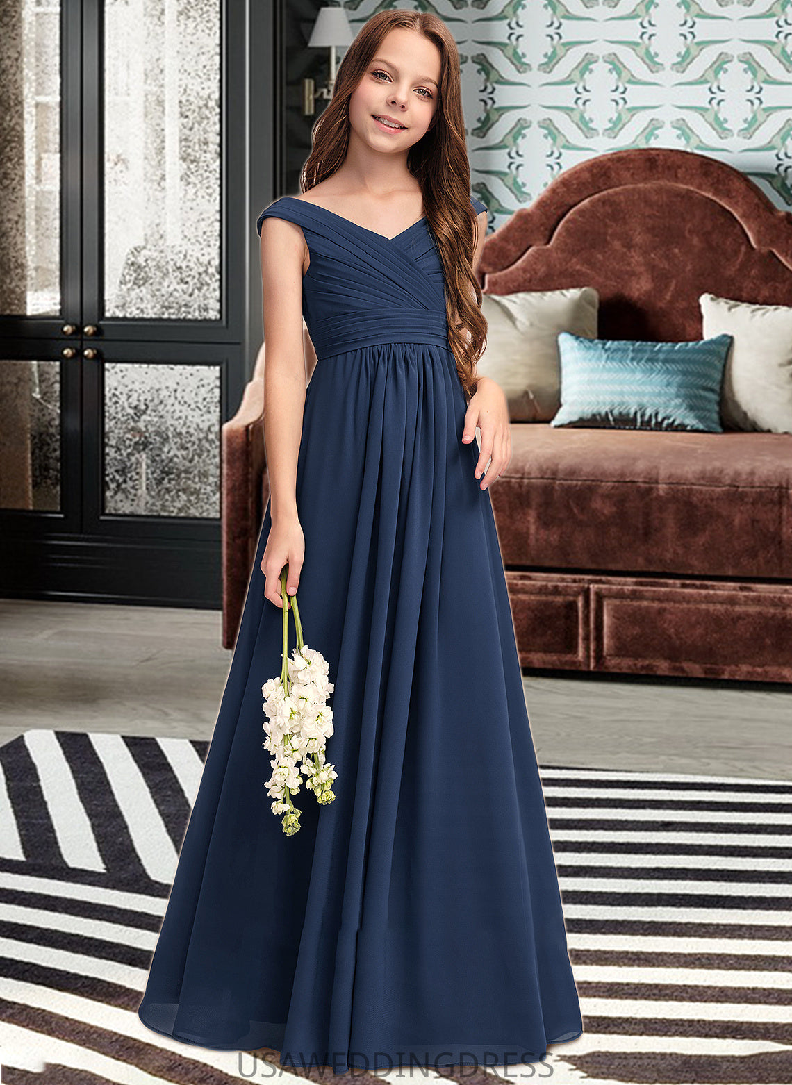Elsie A-Line Off-the-Shoulder Floor-Length Chiffon Junior Bridesmaid Dress With Ruffles DSP0013436