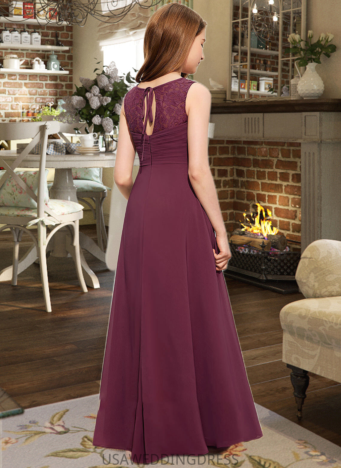 Everly A-Line Scoop Neck Floor-Length Chiffon Lace Junior Bridesmaid Dress With Ruffle Bow(s) DSP0013600
