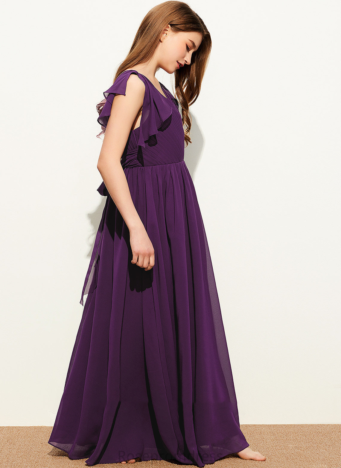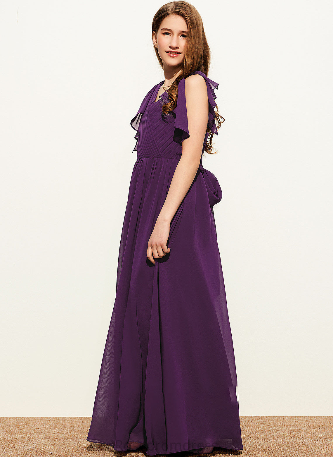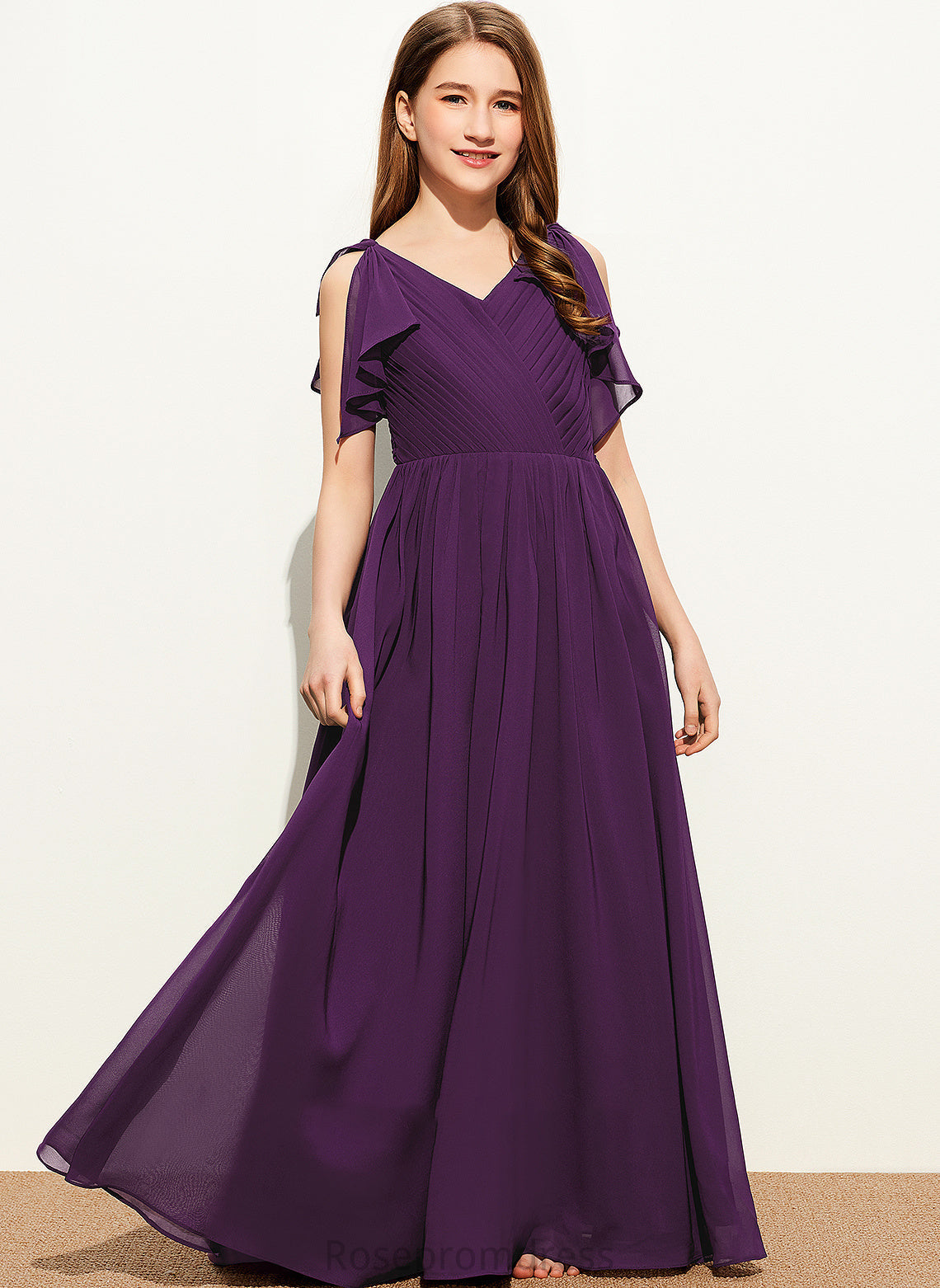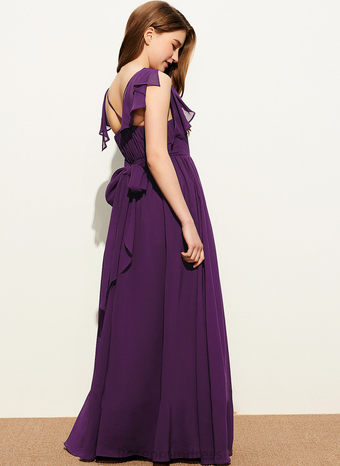 Floor-Length Junior Bridesmaid Dresses Bow(s) A-Line Ruffles Chiffon With V-neck Rosa Cascading