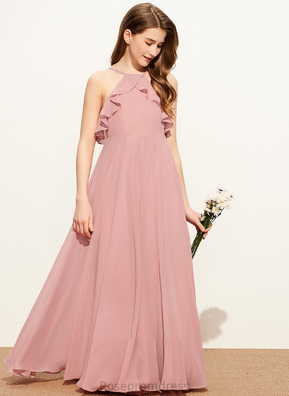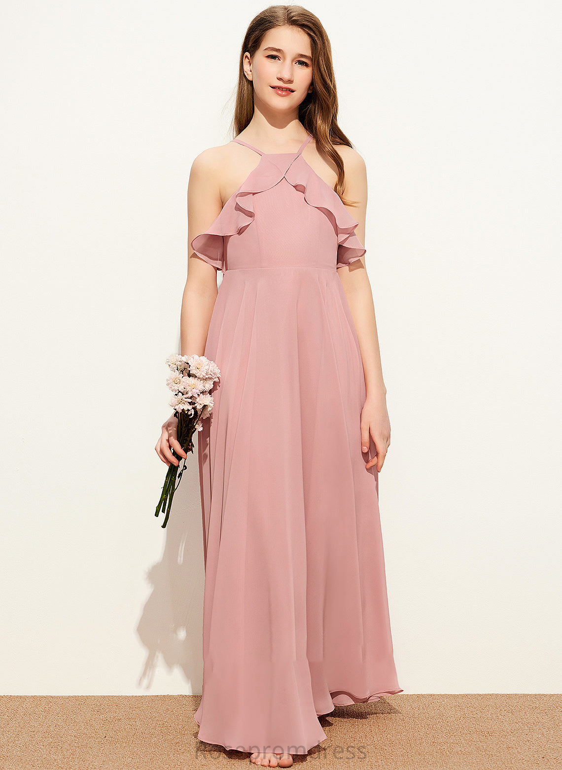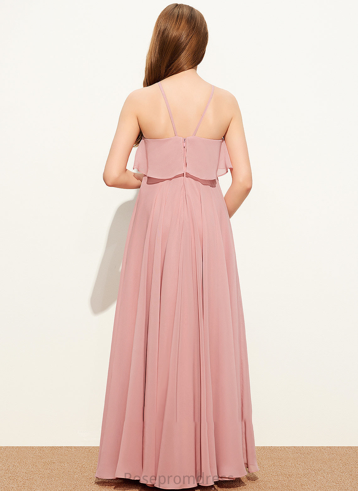 Floor-Length Sanai Ruffles Junior Bridesmaid Dresses Square Cascading Chiffon With A-Line Neckline