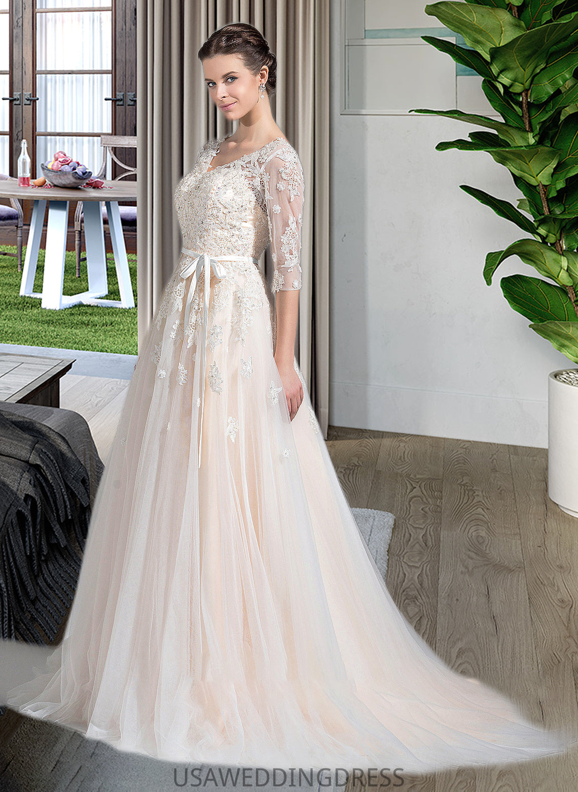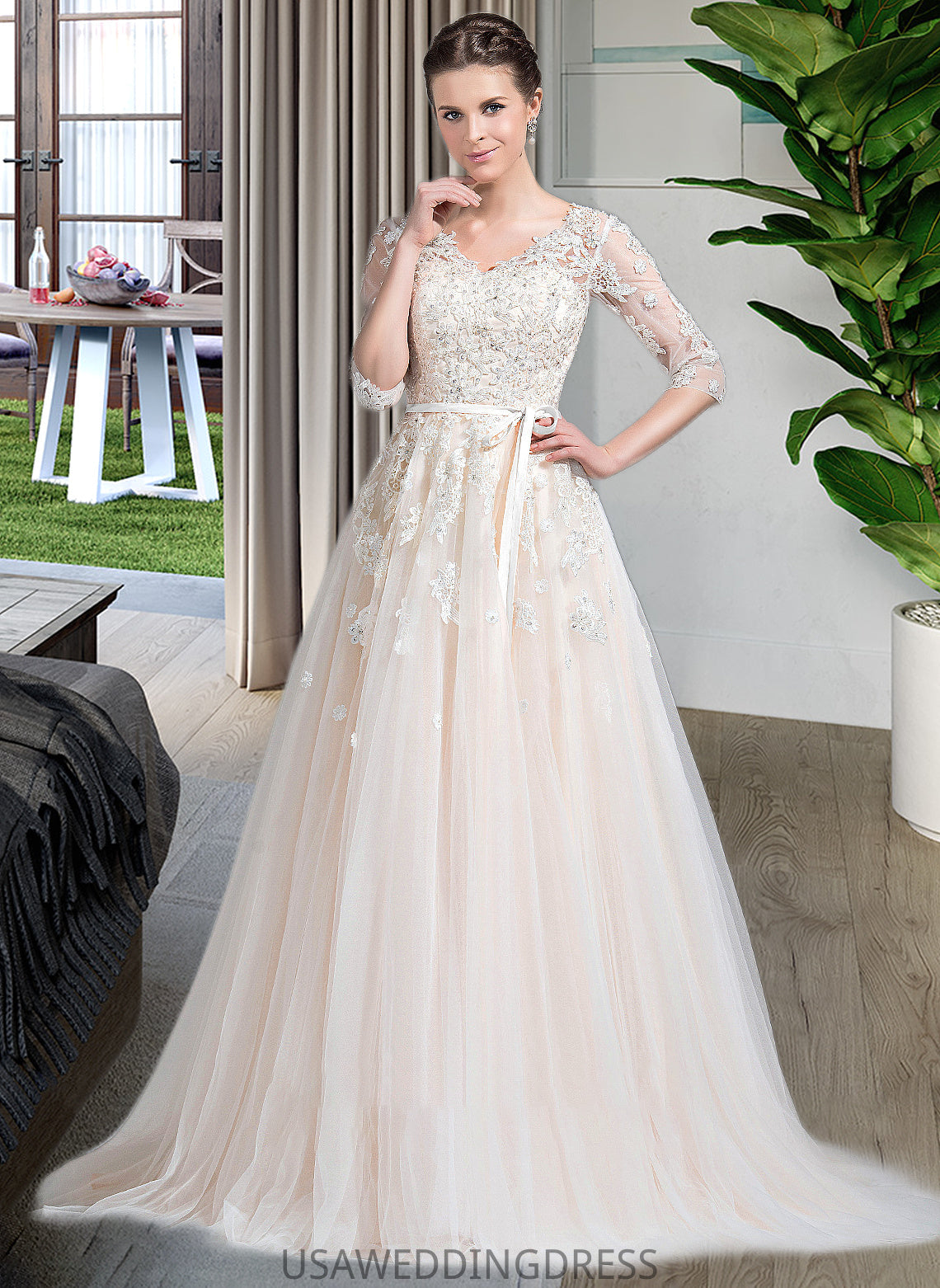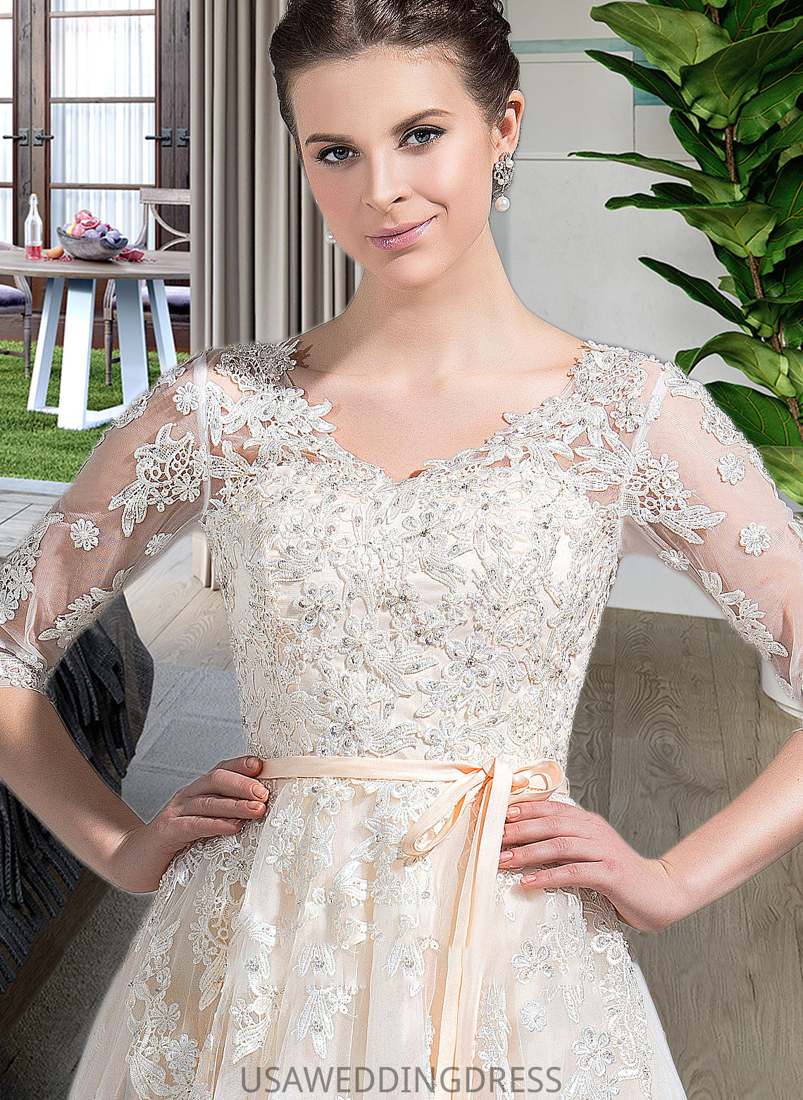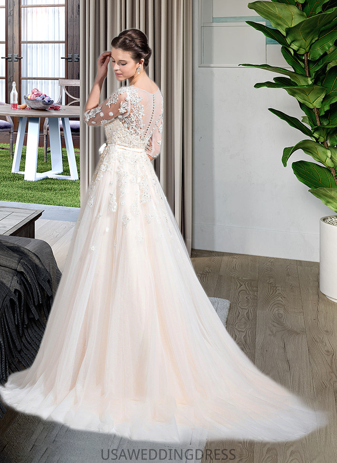 Gisselle Ball-Gown/Princess V-neck Court Train Tulle Wedding Dress With Beading Appliques Lace Sequins Bow(s) DSP0013809