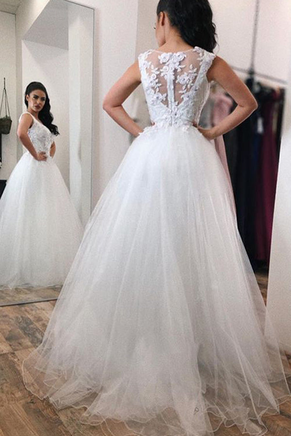 Gorgeous A Line V Neck With Lace Appliques Long Tulle Ball Gown Wedding Dresses