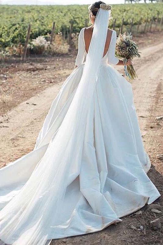 Gorgeous Satin Backless Wedding Dresses 3/4 Sleeve Cathedral Train Bridal Dress