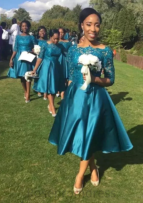 Half Sleeve Scalloped Neck Tea-Length Charmeuse A-line/Princess Bridesmaid Dresseses With Lace Daniella SRSP0025603