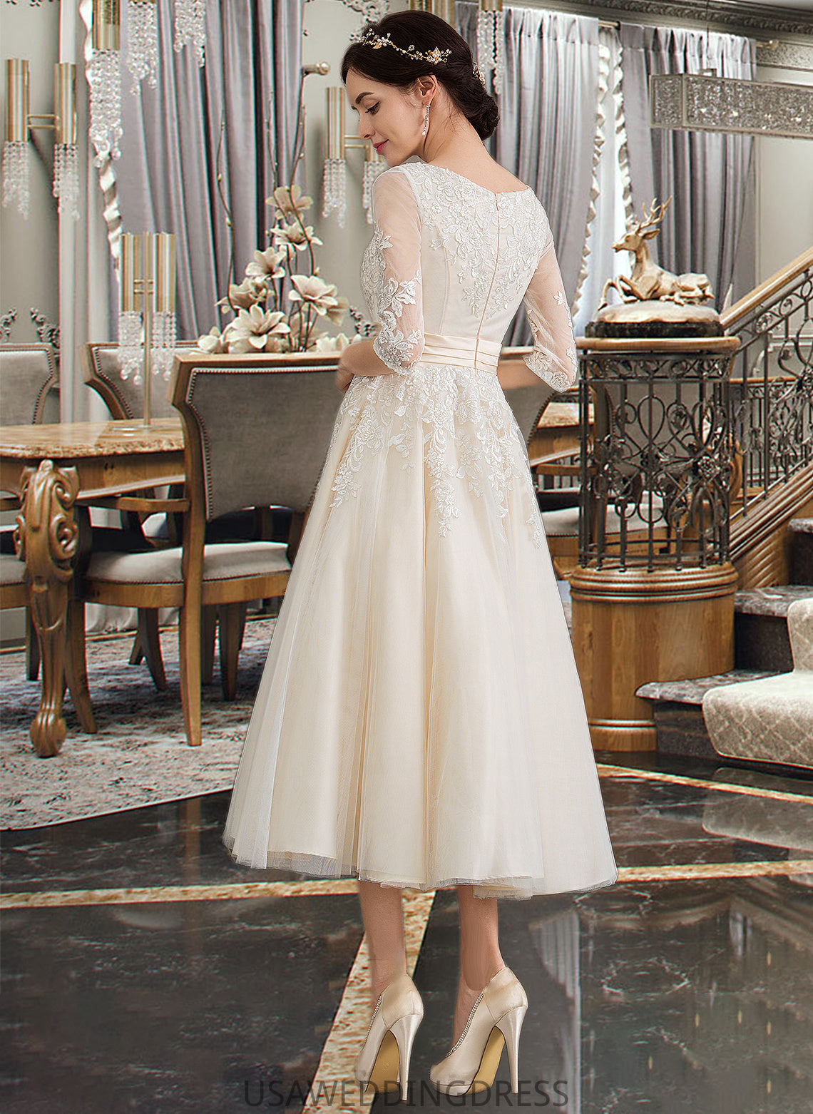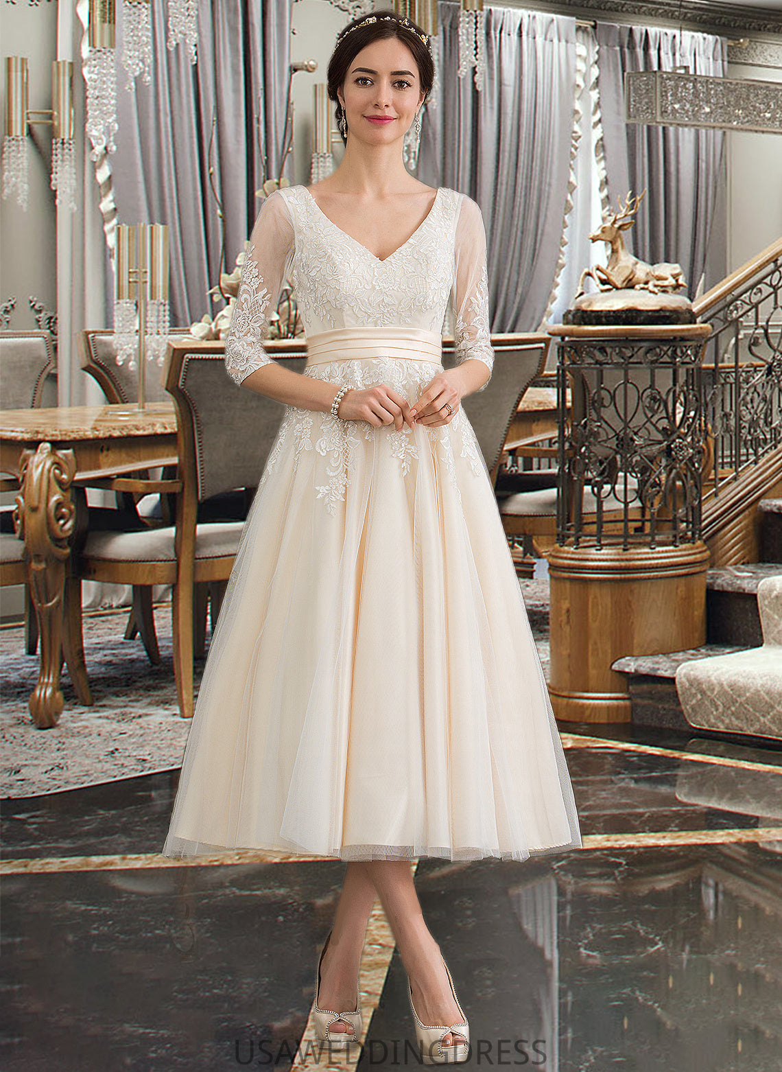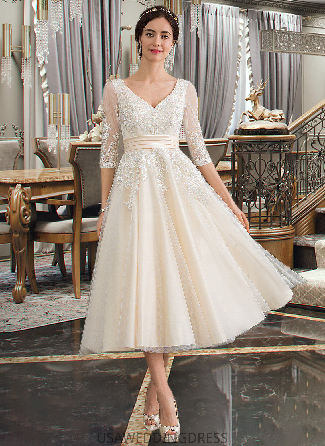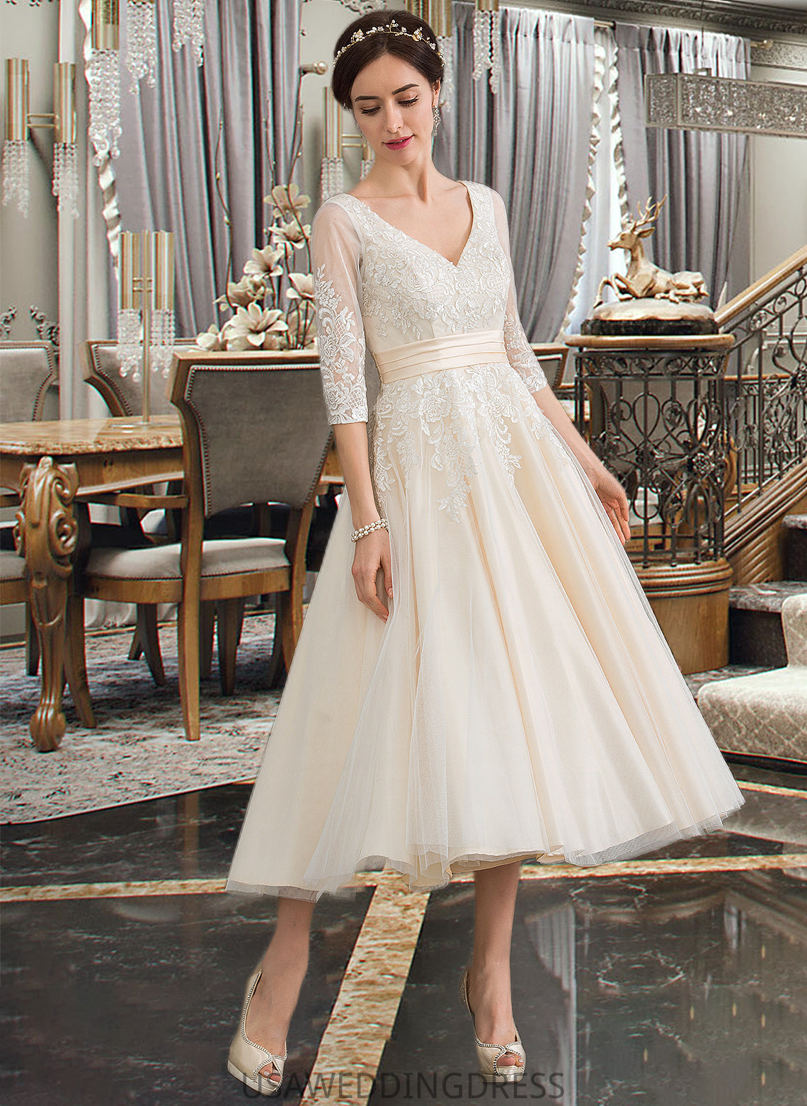 Haylee Ball-Gown/Princess V-neck Tea-Length Tulle Wedding Dress DSP0013731