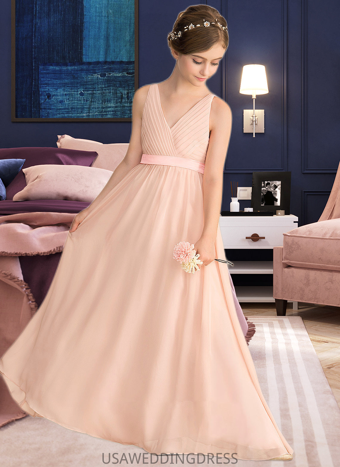 Heidi A-Line V-neck Floor-Length Chiffon Junior Bridesmaid Dress With Ruffle Bow(s) DSP0013402