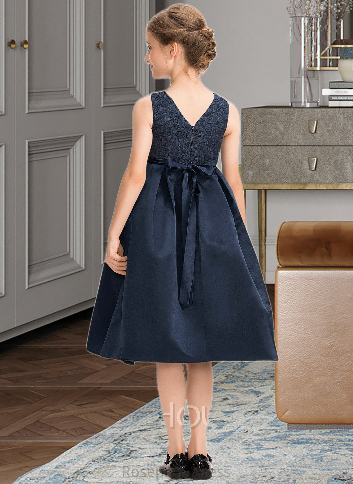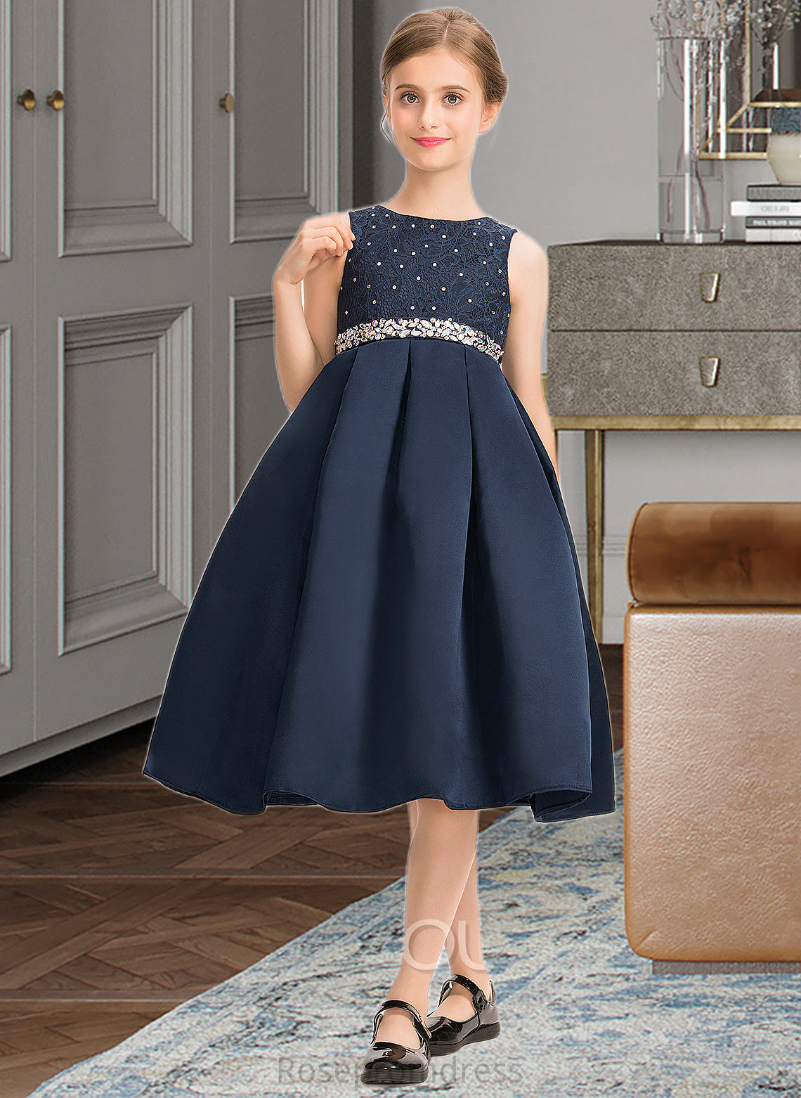Helen A-Line Scoop Neck Knee-Length Satin Lace Junior Bridesmaid Dress With Beading Bow(s) SRSP0013559
