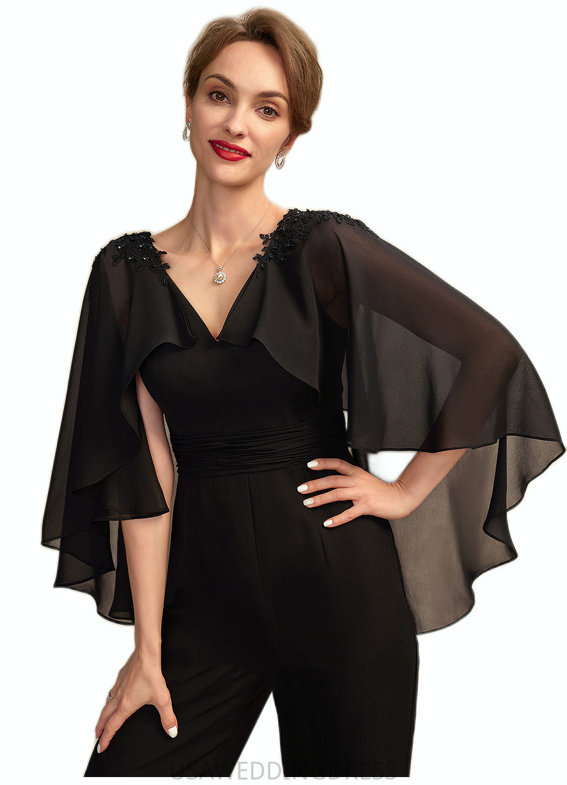 Helena Jumpsuit/Pantsuit V-neck Floor-Length Chiffon Mother of the Bride Dress With Ruffle Beading Appliques Lace Sequins DS126P0015033