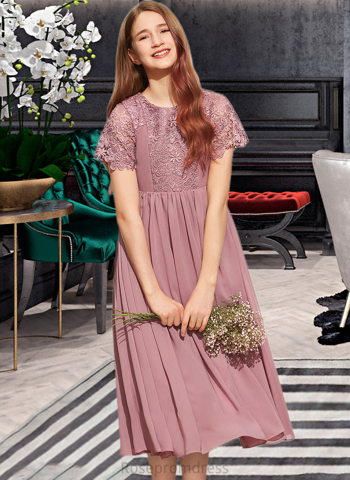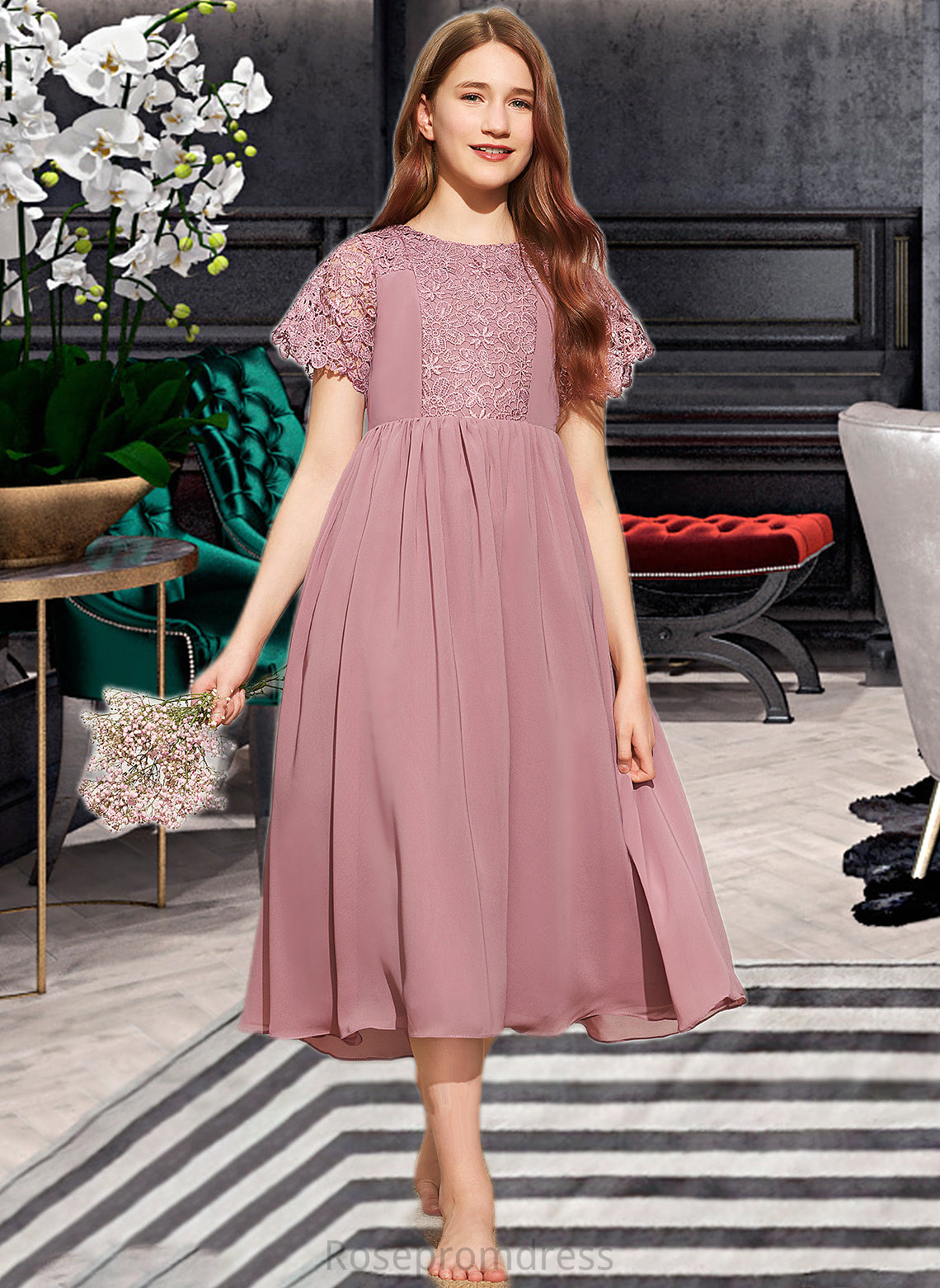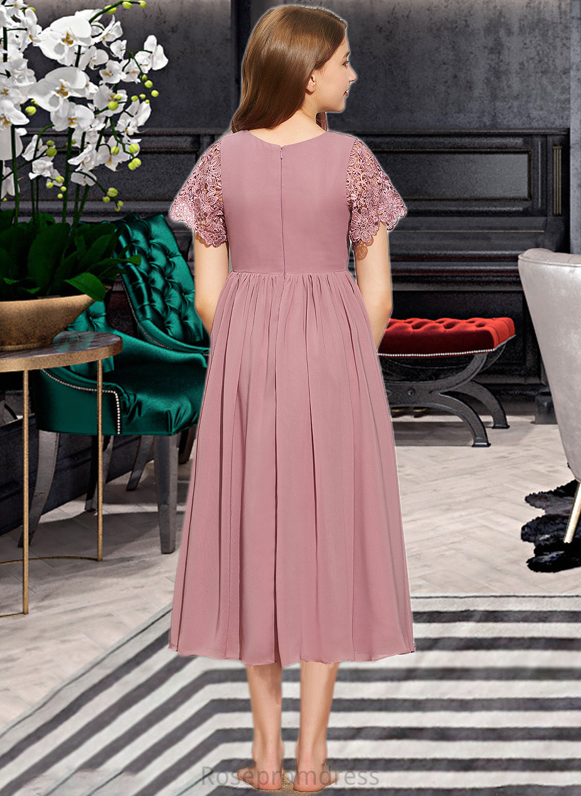 Helga A-Line Scoop Neck Tea-Length Chiffon Lace Junior Bridesmaid Dress SRSP0013648