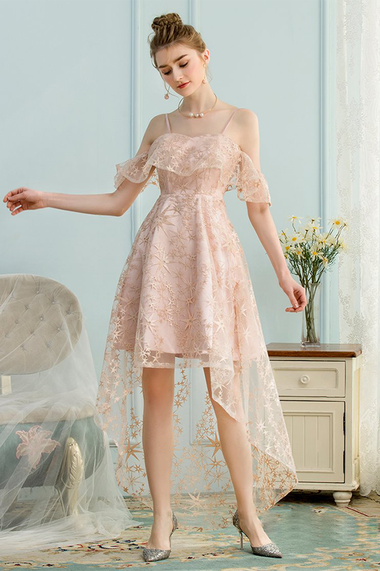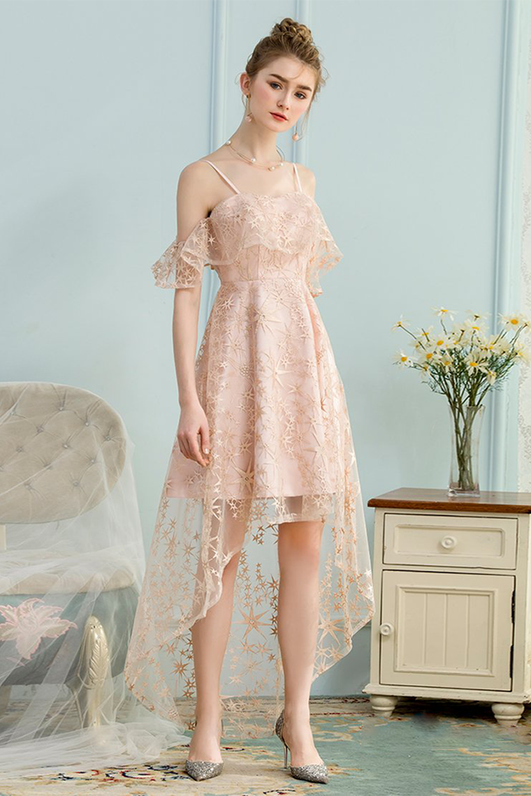 High Low A-Line Spaghetti Lace Homecoming Dresses Ximena Pink Straps Ice