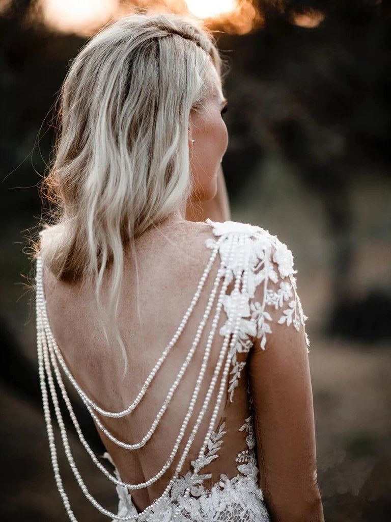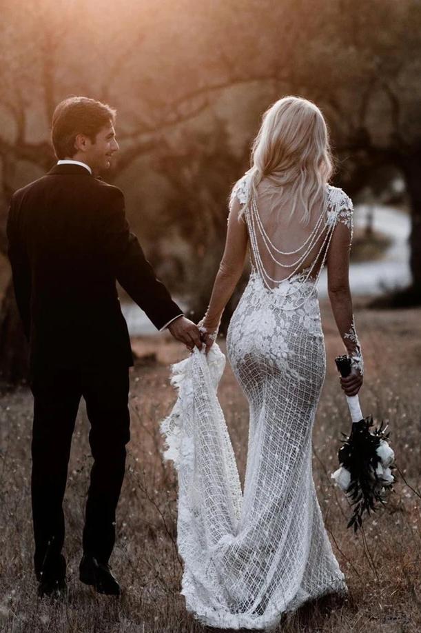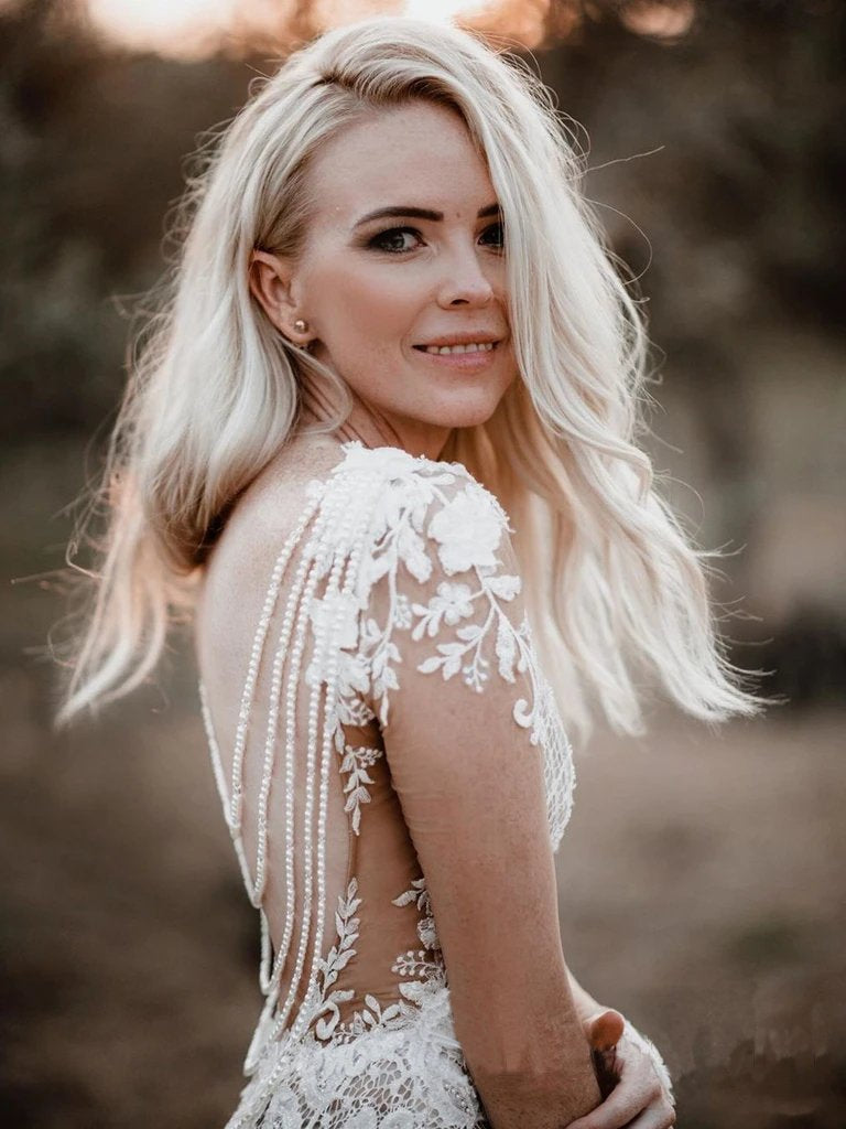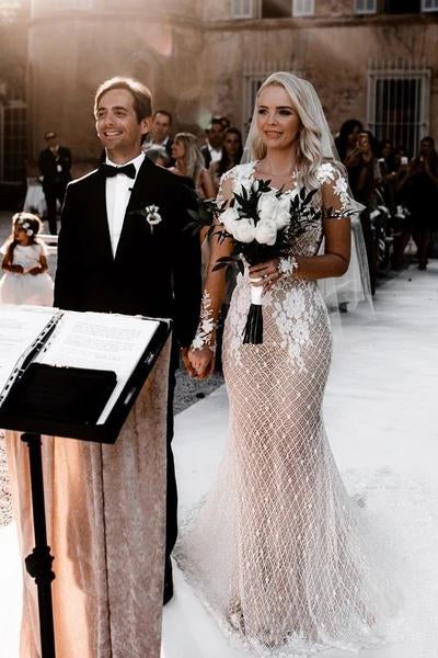 Illusion Long Sleeves Special Lace Floral Appliques Wedding Dress with Sweep SRS15649