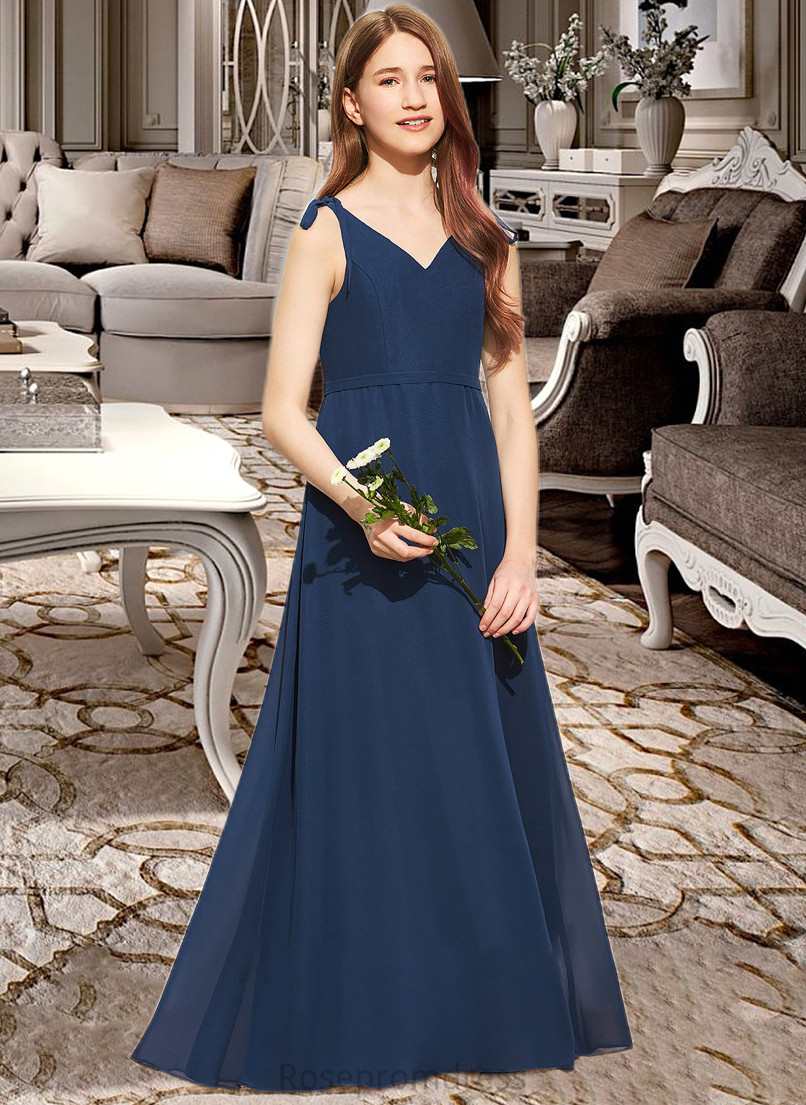 Ina A-Line V-neck Floor-Length Chiffon Junior Bridesmaid Dress With Bow(s) SRSP0013548