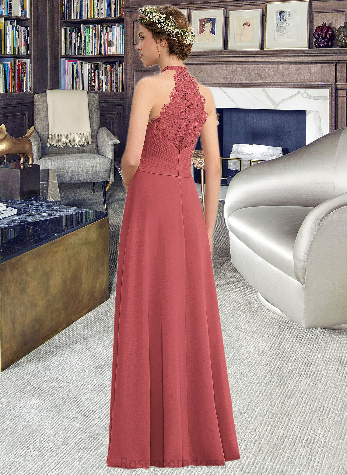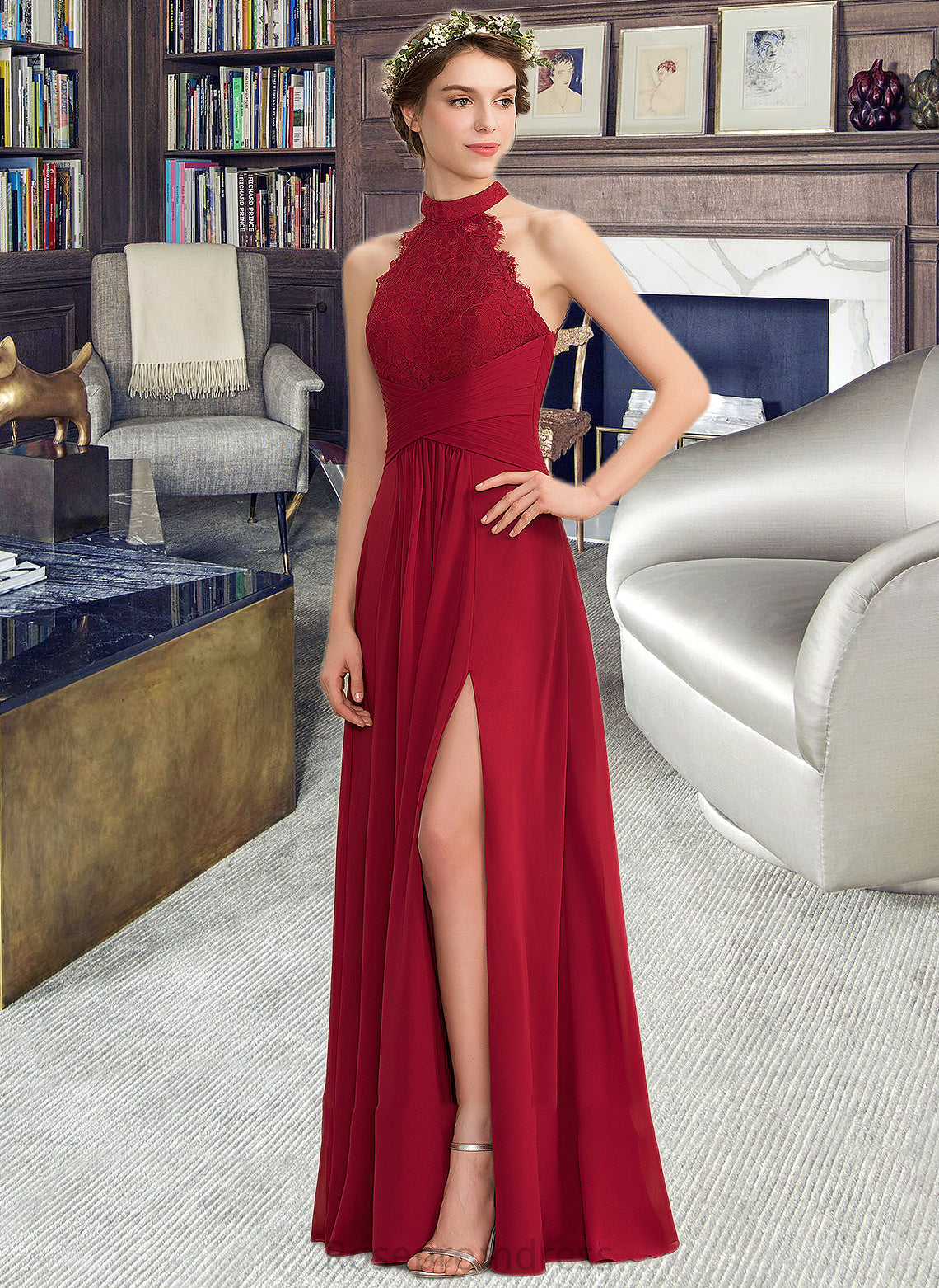 Isabel A-Line High Neck Floor-Length Chiffon Lace Bridesmaid Dress With Ruffle Split Front SRSP0013065