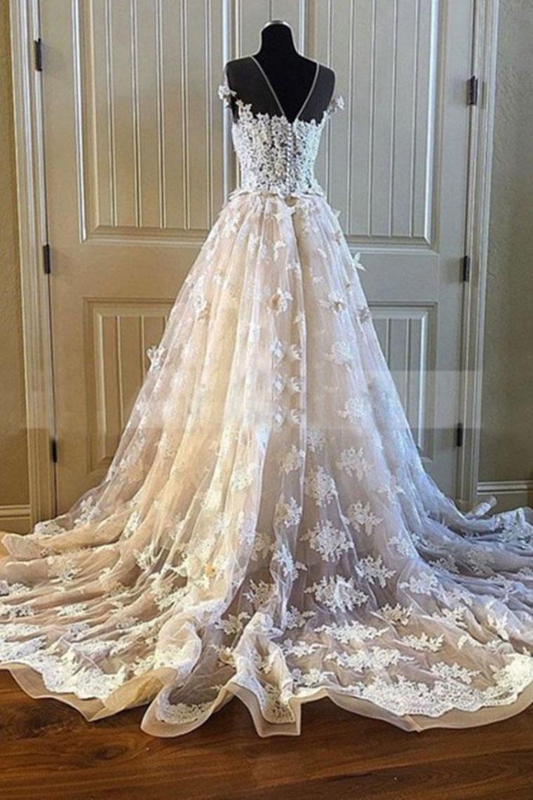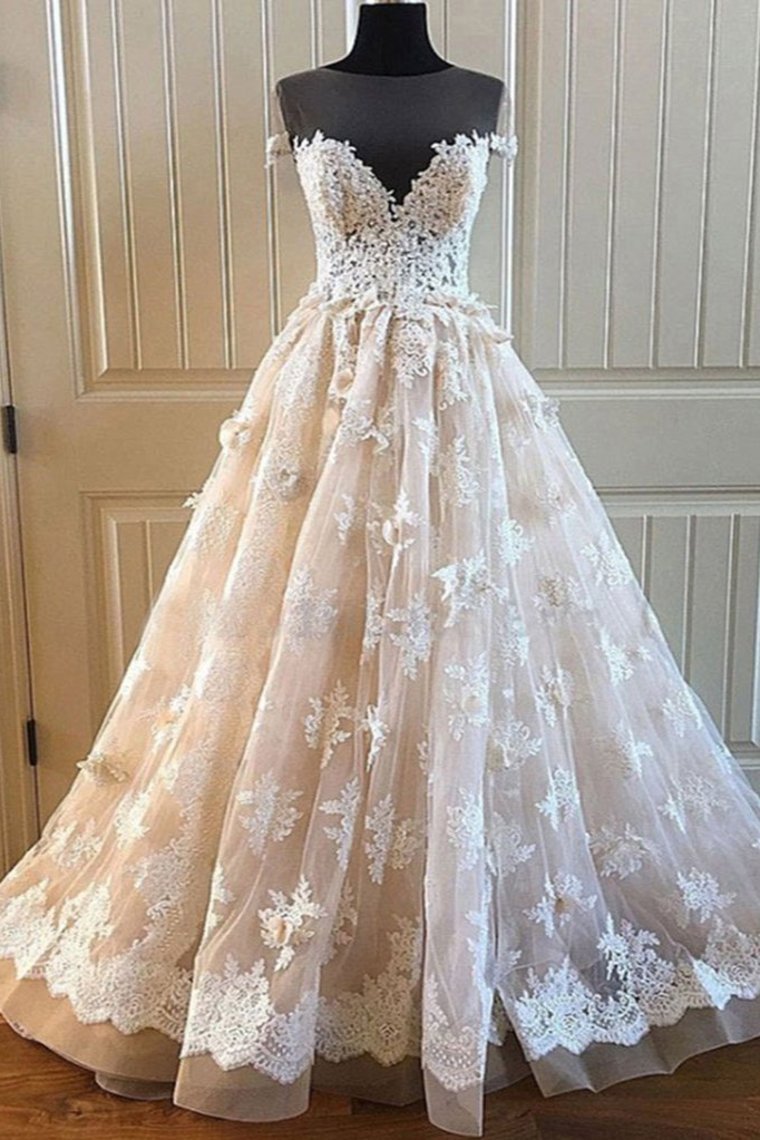 Ivory And Champagne Long Cap Sleeves Lace Tulle Wedding Dresses