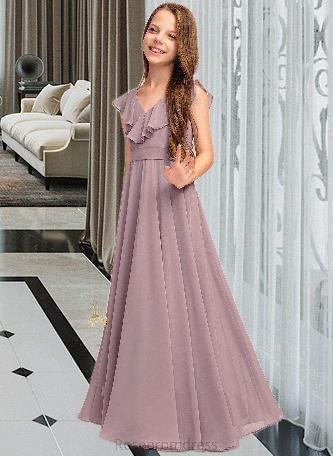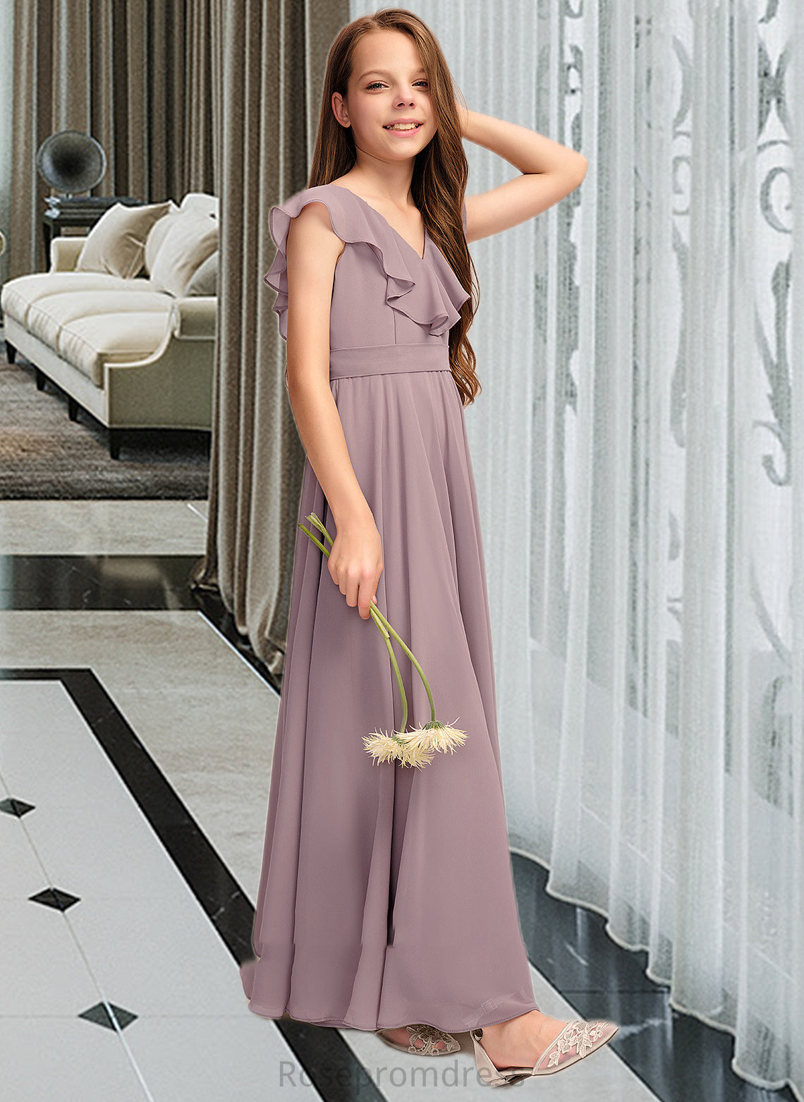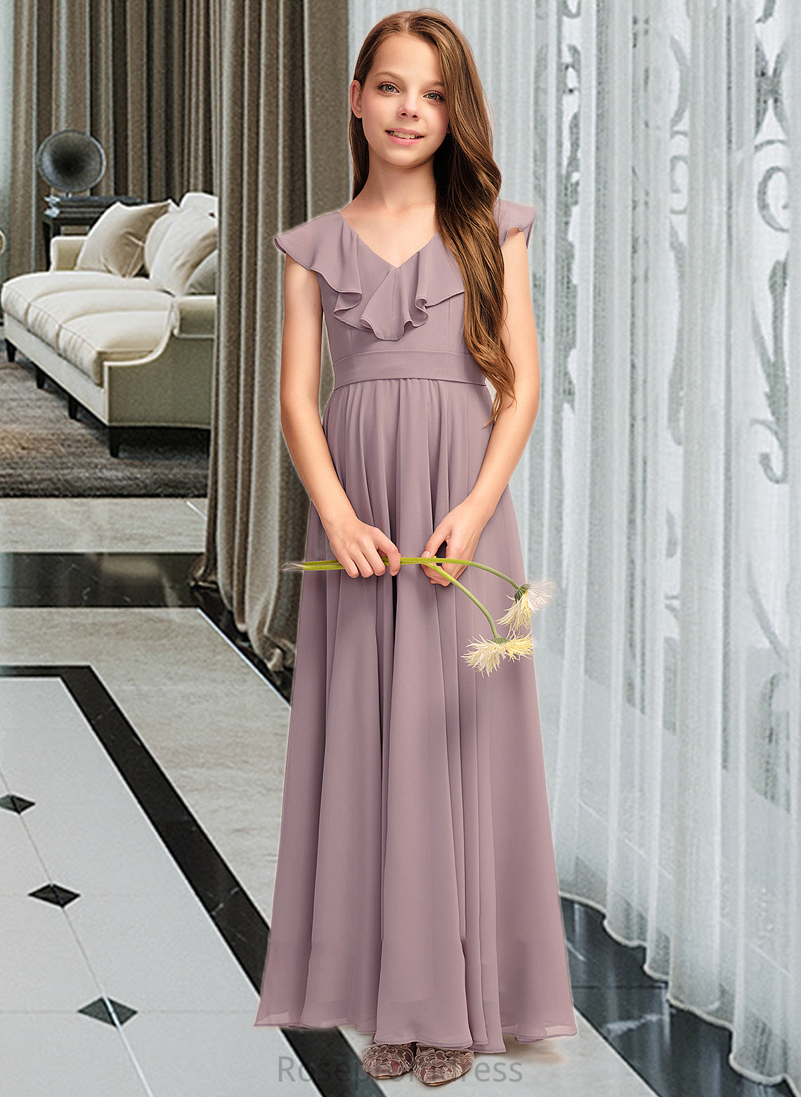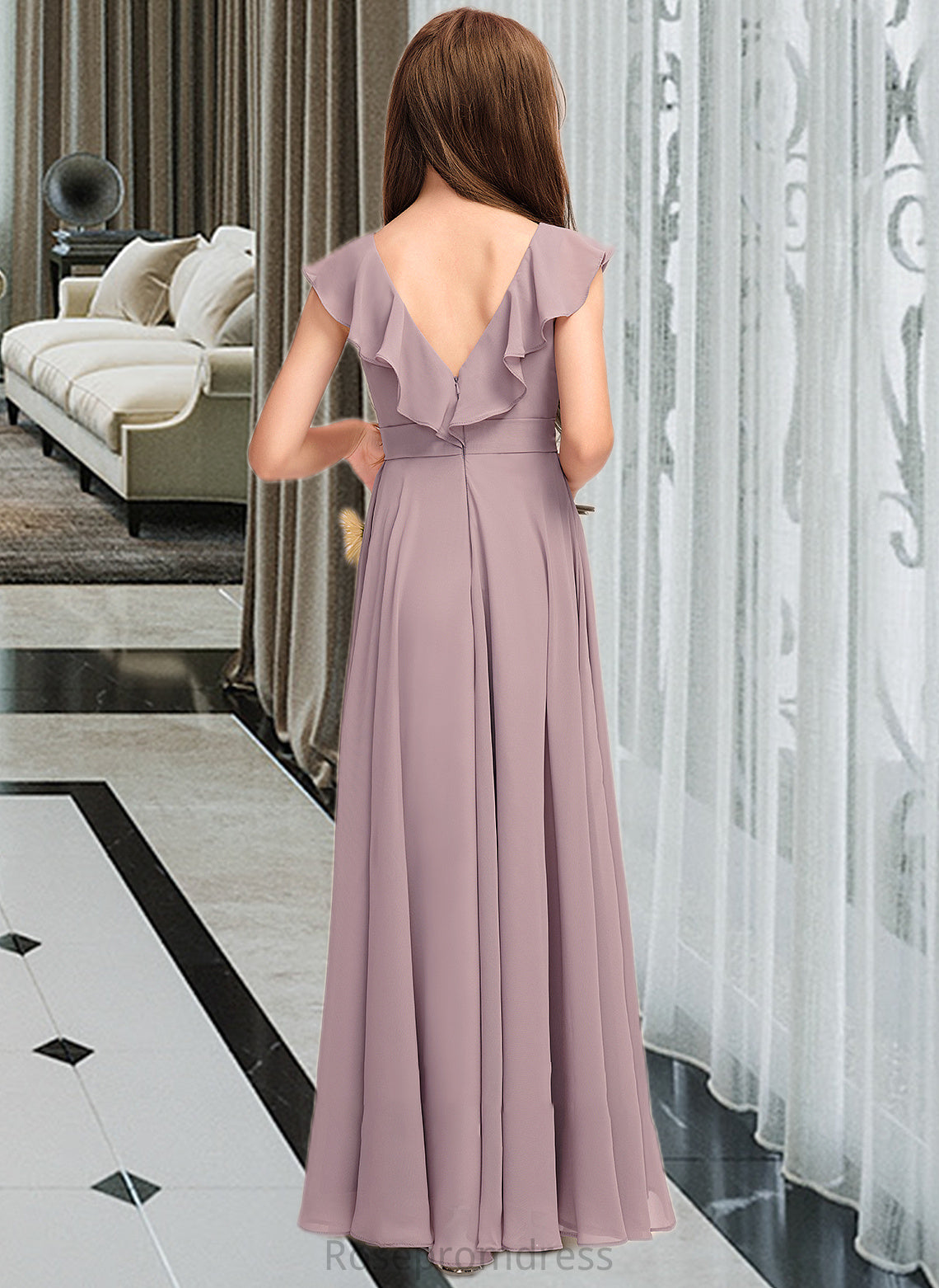 Izabella A-Line V-neck Floor-Length Chiffon Junior Bridesmaid Dress With Cascading Ruffles SRSP0013464