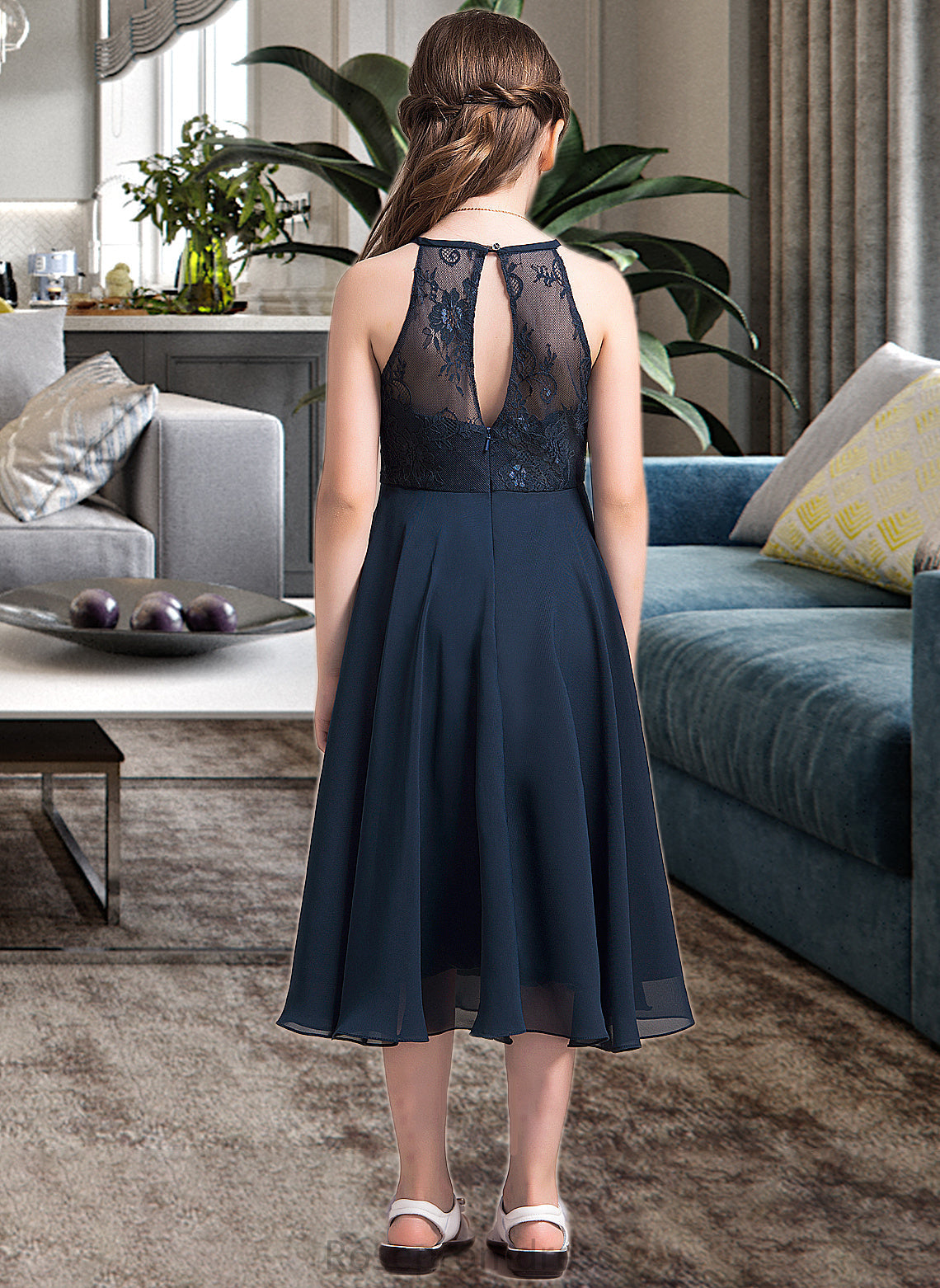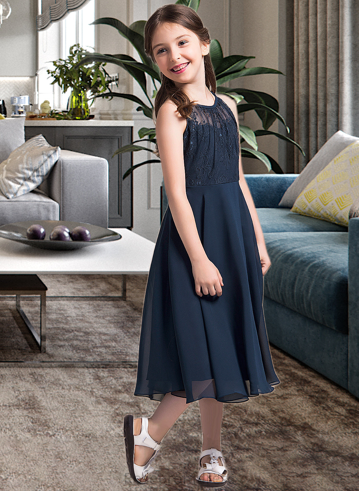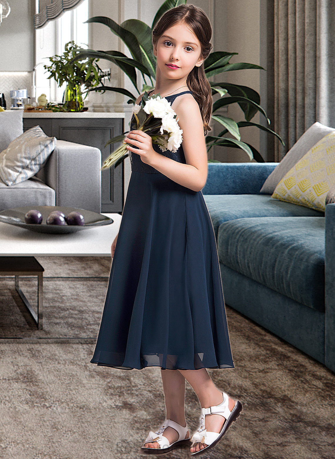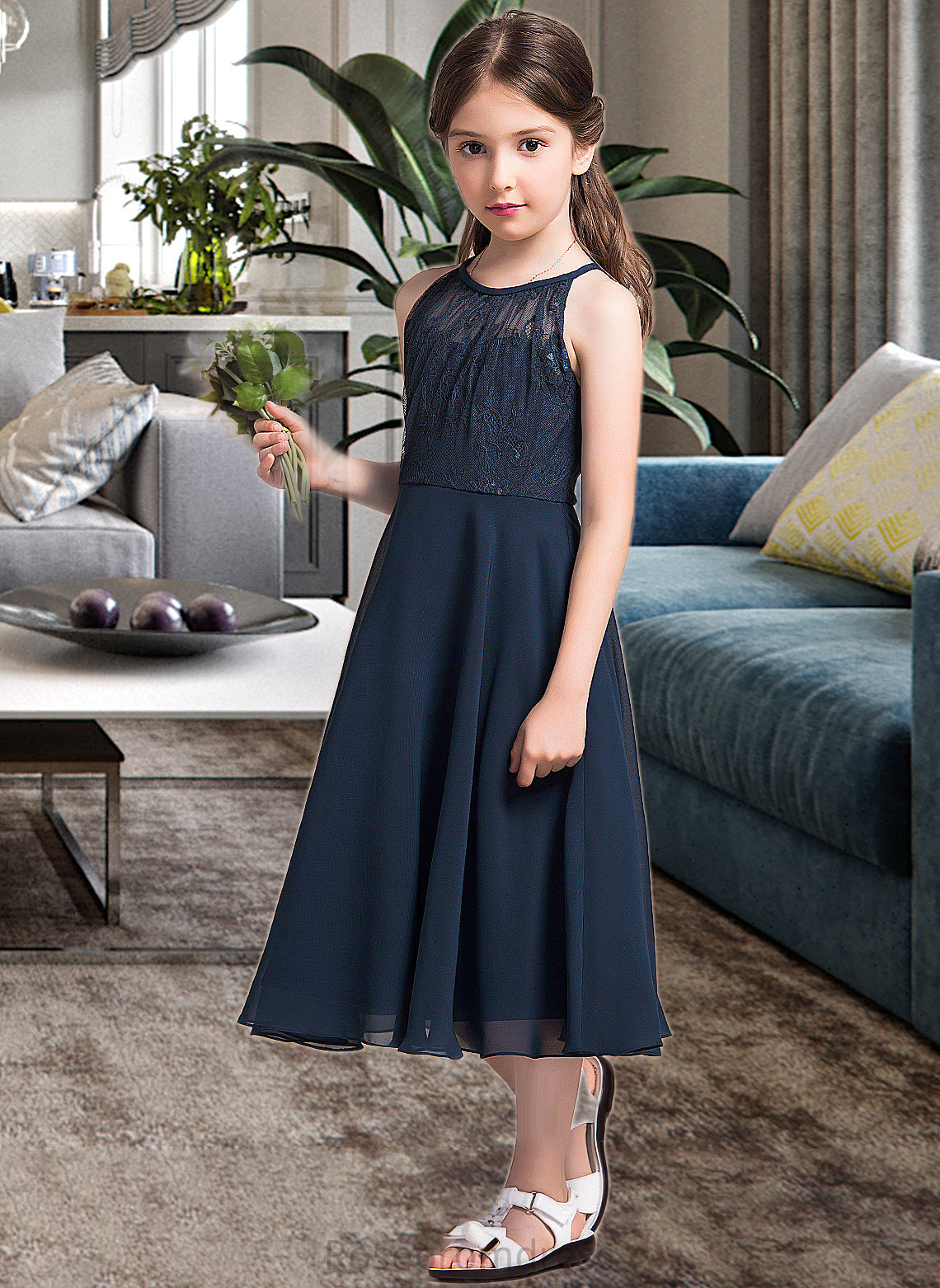 Jada A-Line Scoop Neck Tea-Length Chiffon Lace Junior Bridesmaid Dress With Ruffle SRSP0013536