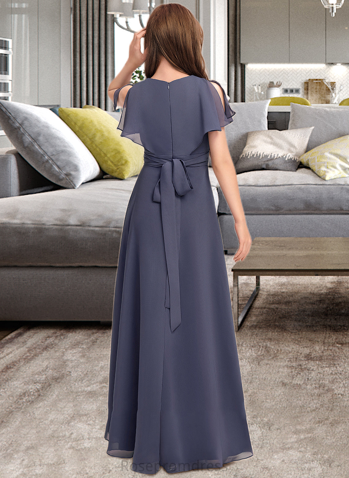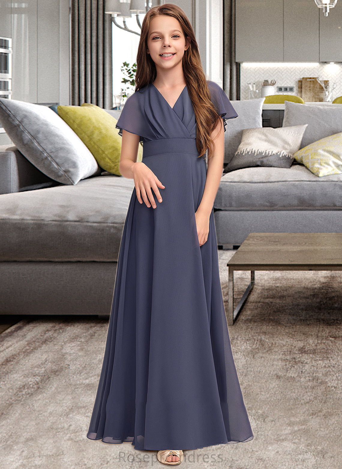 Jaelyn A-Line V-neck Floor-Length Chiffon Junior Bridesmaid Dress With Ruffle Bow(s) SRSP0013369