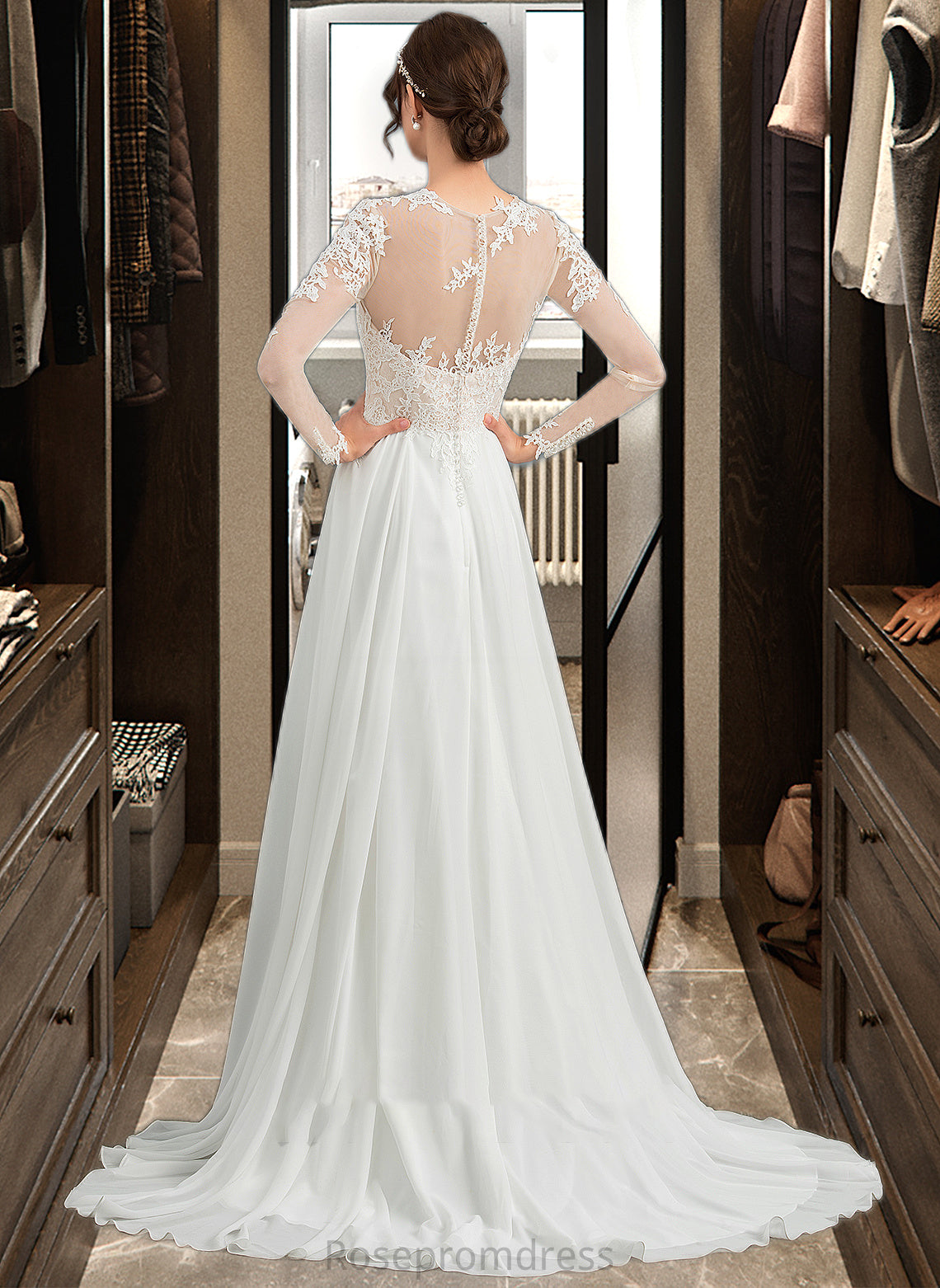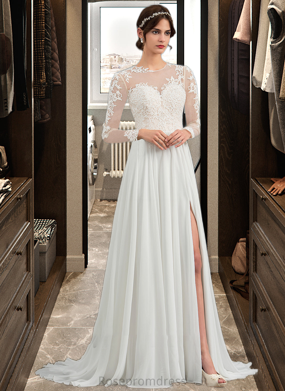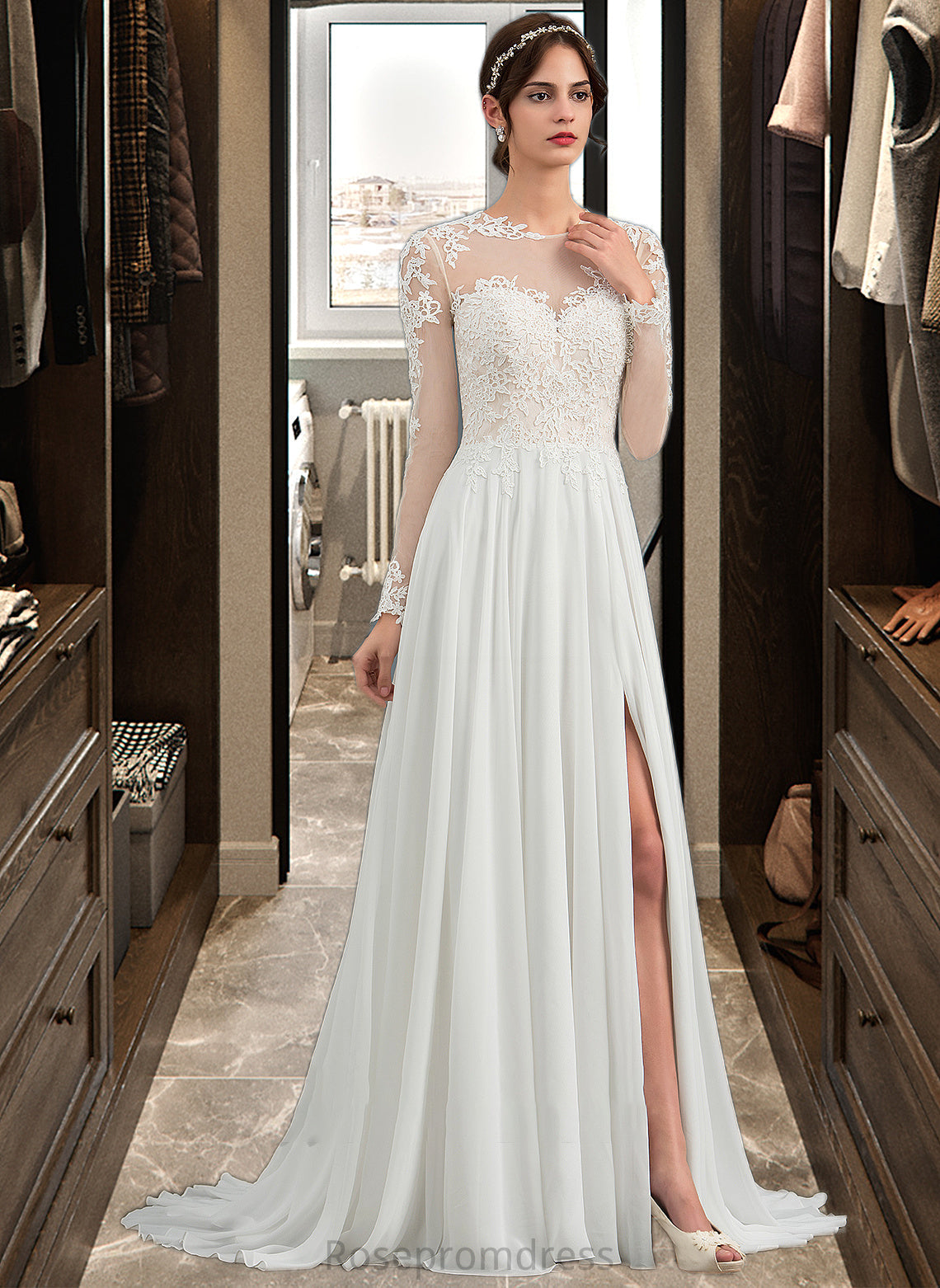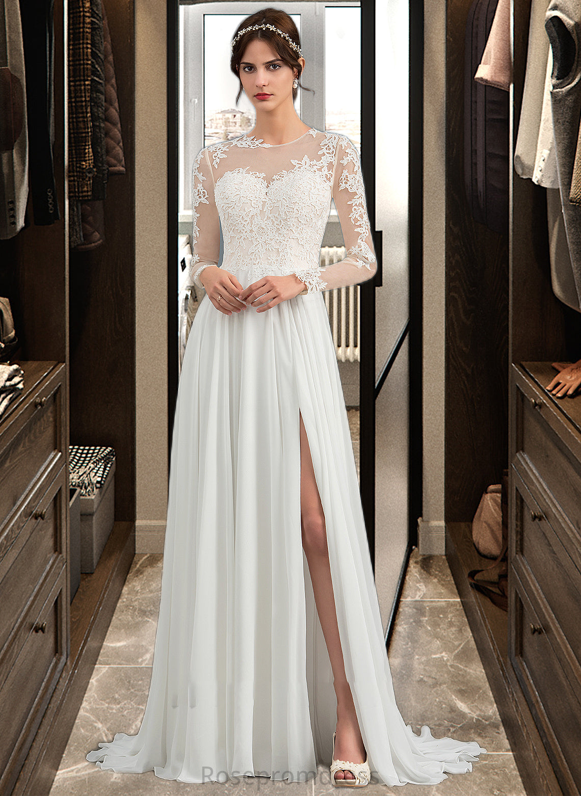 Jaliyah A-Line Illusion Sweep Train Chiffon Wedding Dress With Appliques Lace Split Front SRSP0013793