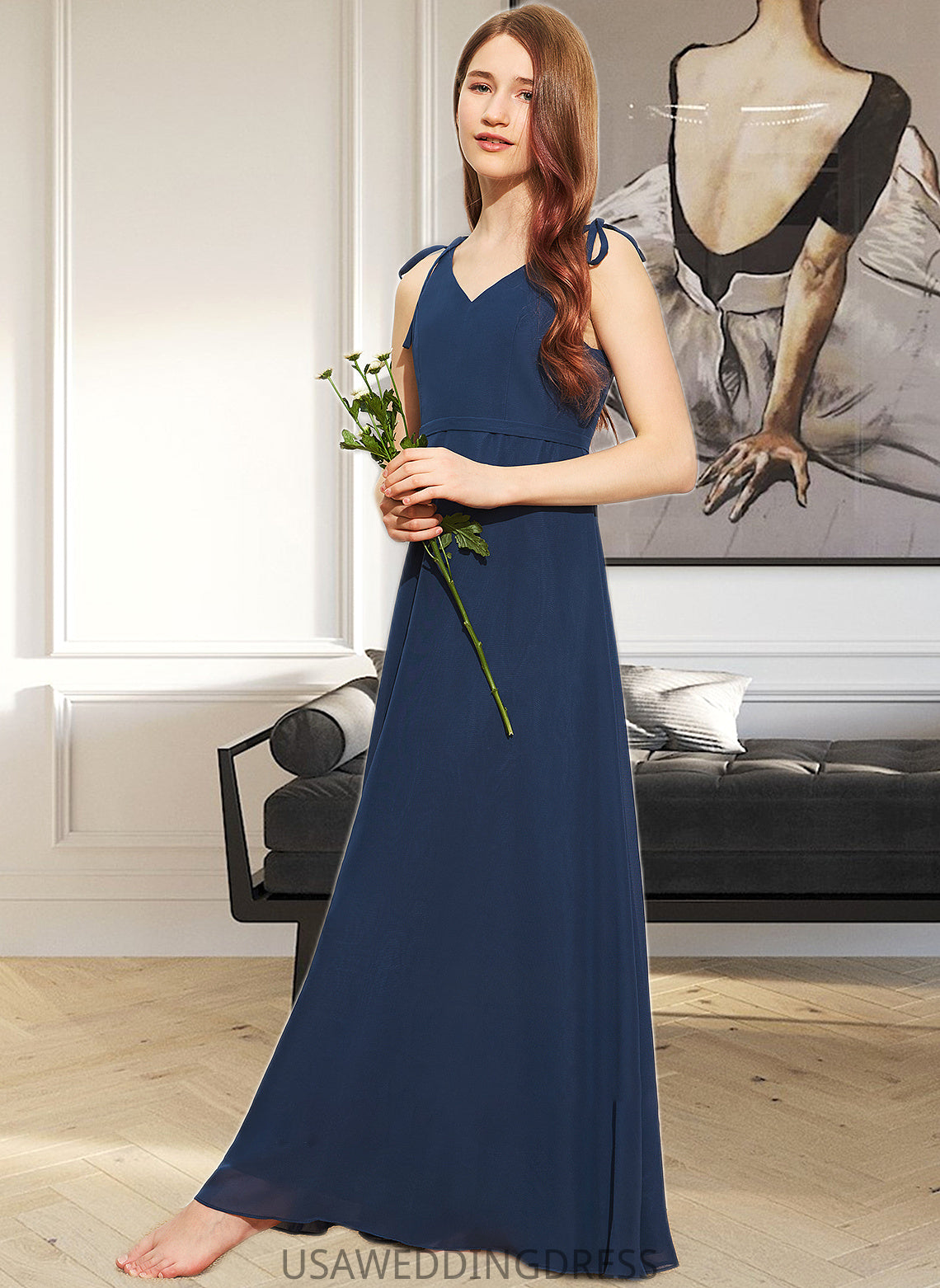 Jamiya A-Line V-neck Floor-Length Chiffon Junior Bridesmaid Dress With Bow(s) DSP0013548