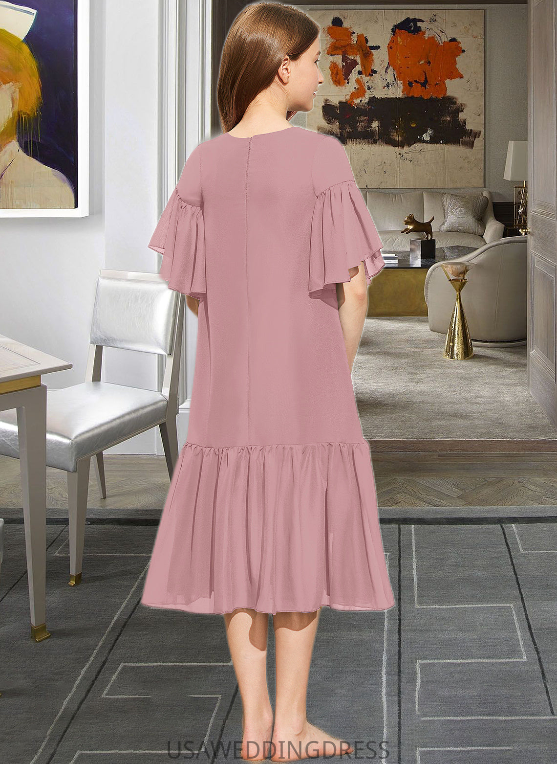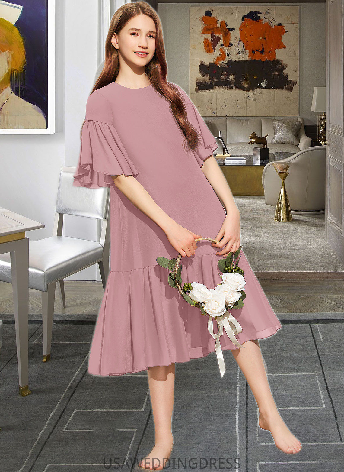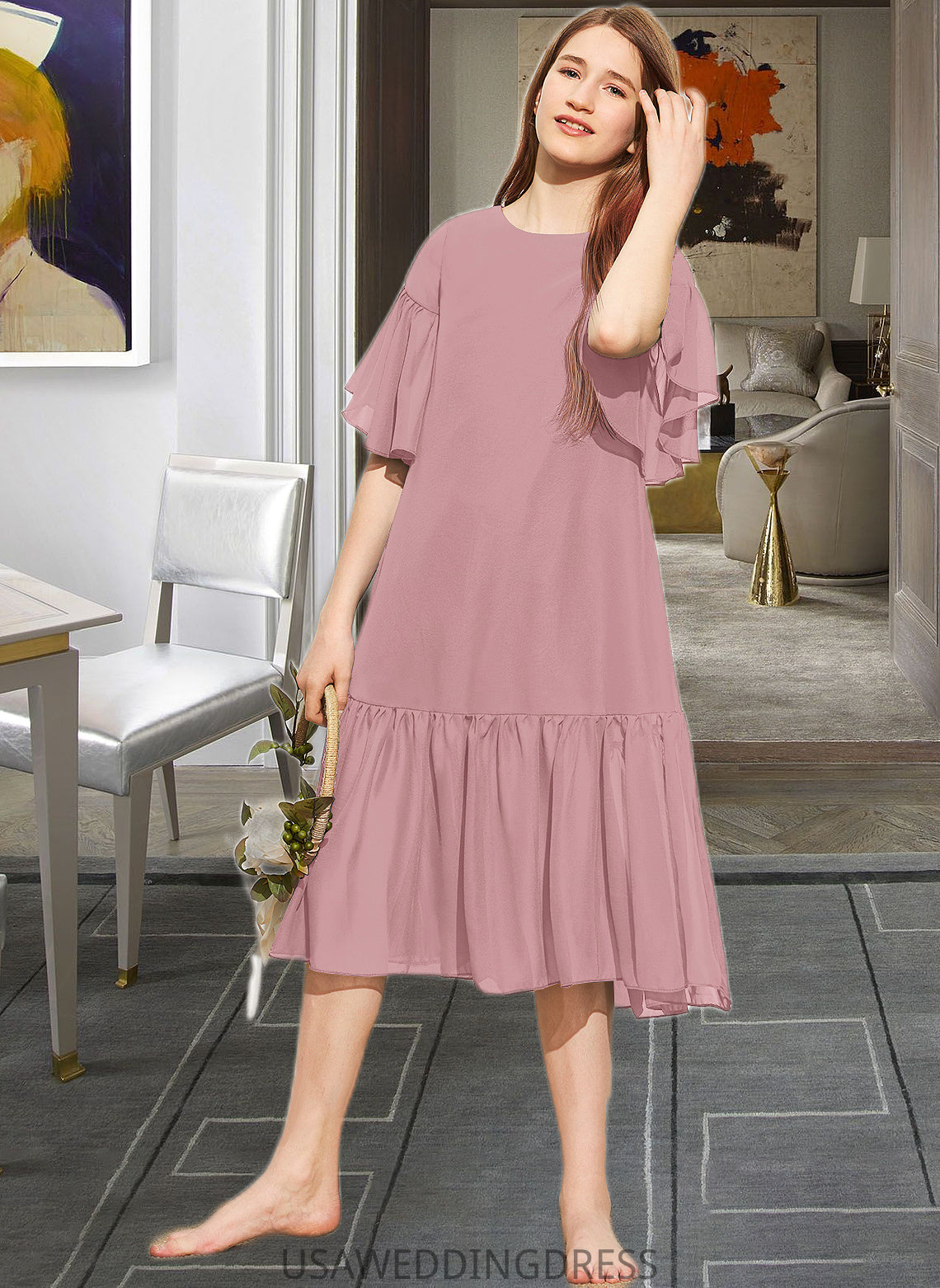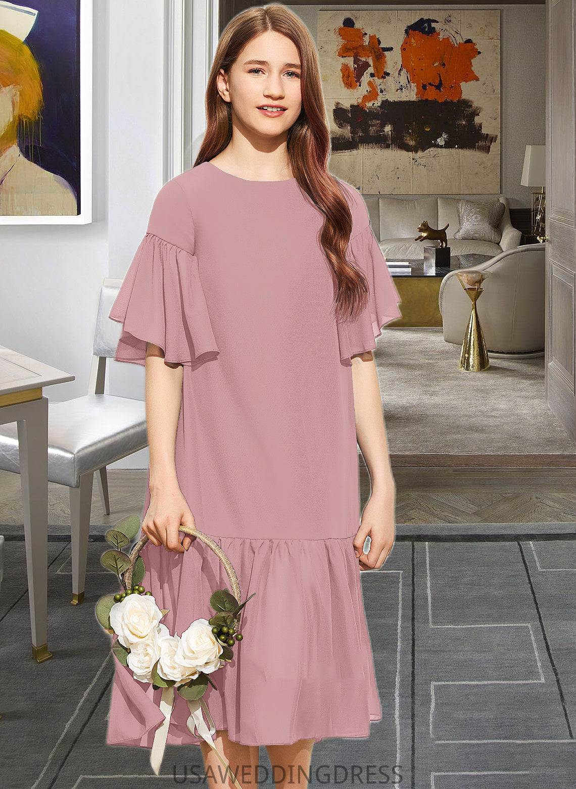 Jamya A-Line Scoop Neck Knee-Length Chiffon Junior Bridesmaid Dress With Cascading Ruffles DSP0013656